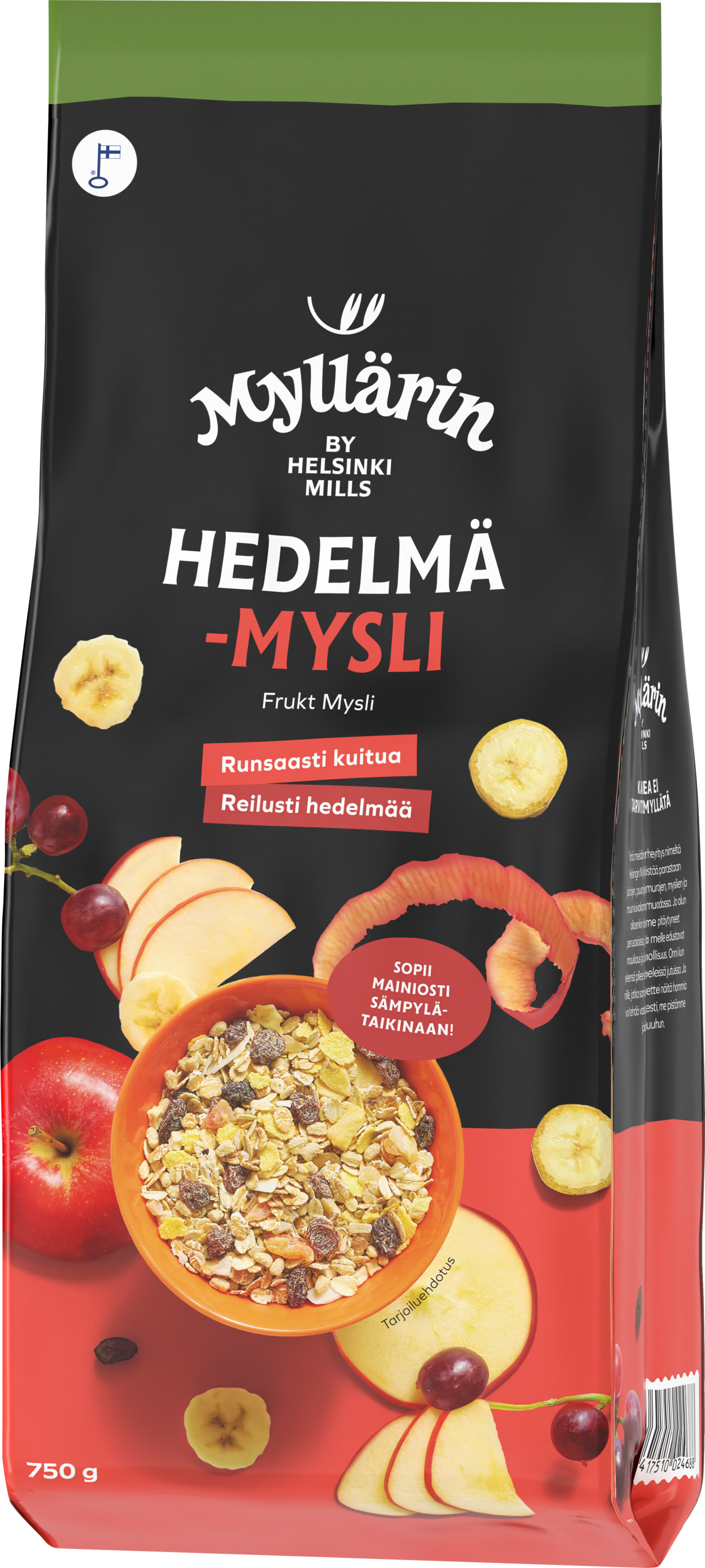 Myllärin suosikkimysli sisältää runsaskuituista kotimaista täysjyväkauraa, vehnähiutaleita ja runsaasti hedelmiä. Maistuu aamu- ja välipalana ja sopii myös loistavasti leivontaan, vaikkapa sämpylätaikinoihin. Tuotteella on Avainlippu. Pakkauksen voi kierrättää keräyskartonkina.