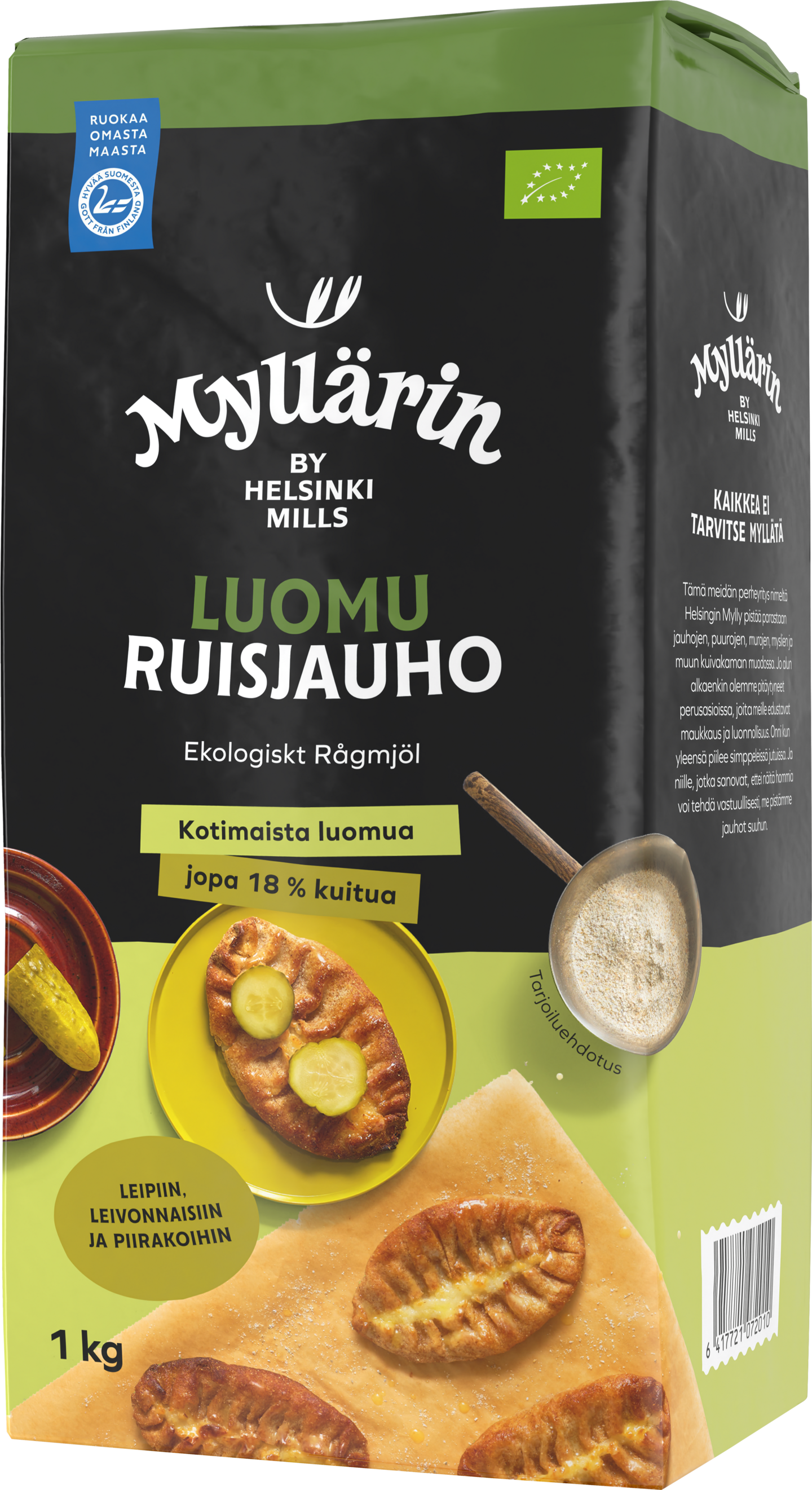 VegaaninenMyllärin Luomu Ruisjauhosta loihdit rapeakuoriset leivät ja piirakat - ja makeat leivonnaiset. Runsaskuituisella tuotteella on Hyvää Suomesta Joutsenlippu -alkuperämerkki sekä Luomumerkki. Pakkauksen voi kierrättää keräyskartonkina.