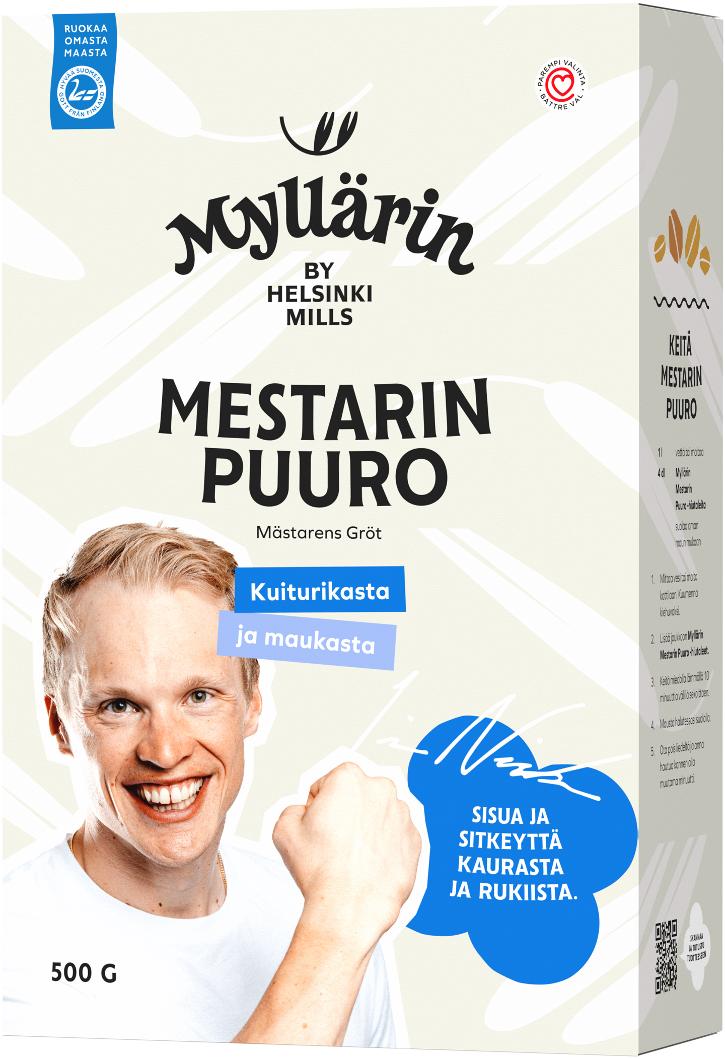VegaaninenMestarin Puuro on pitkän harjoittelun tulos. Ainutlaatuinen sekoitus maistuvaa kauraa ja ruista tarjoaa sekä keholle että ympäristölle täydellisen yhdistelmän ravinteita ja pitkäkestoista energiaa. Mestarin Puuron voimalla jokainen jaksaa pinnistää ja ponnistaa oman elämänsä mestariksi… ja ainakin Iivon mukaan se tekee myös onnelliseksi. Tuotteella on Hyvää Suomesta Joutsenlippu -alkuperämerkki sekä Sydänmerkki. Pakkauksen voi kierrättää keräyskartonkina.