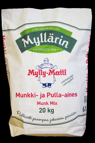 VegaaninenMyllärin Munkki- & Pulla-ainekset on valmis seos herkullisten munkkien, pullien, donitsien ja muiden paistokkaiden valmistukseen. Lisää vain vesi, hiiva ja halutessasi kanamuna. Säkistä syntyy n. 560 munkkirinkilää. Pakkauksen sisäpussi menee muovinkeräykseen ja ulkopakkaus kartonkikeräykseen tai koko pakkaus energiajätteeseen.