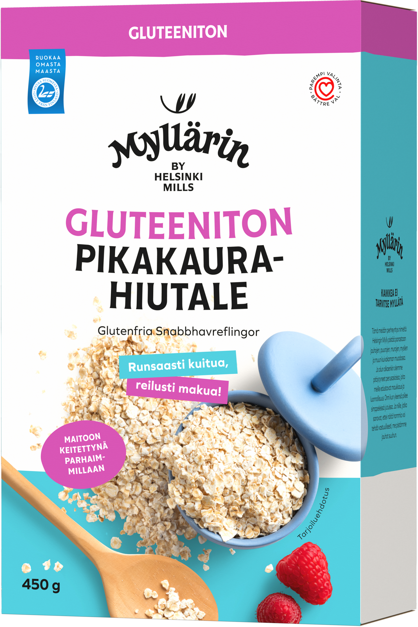 Myllärin kotimaisesta, gluteenittomasti viljellystä kaurasta valmistuu runsaskuituinen puuro. Täydellisen lopputuloksen saat, kun keität puurosi maitoon tai kasvimaitoon. Kaurahiutaleilla lisäät makua ja rakennetta myös suolaisiin ja makeisiin leivonnaisiin. Tuotteella on Hyvää Suomesta Joutsenlippu -alkuperämerkki. Pakkauksen voi kierrättää keräyskartonkina.