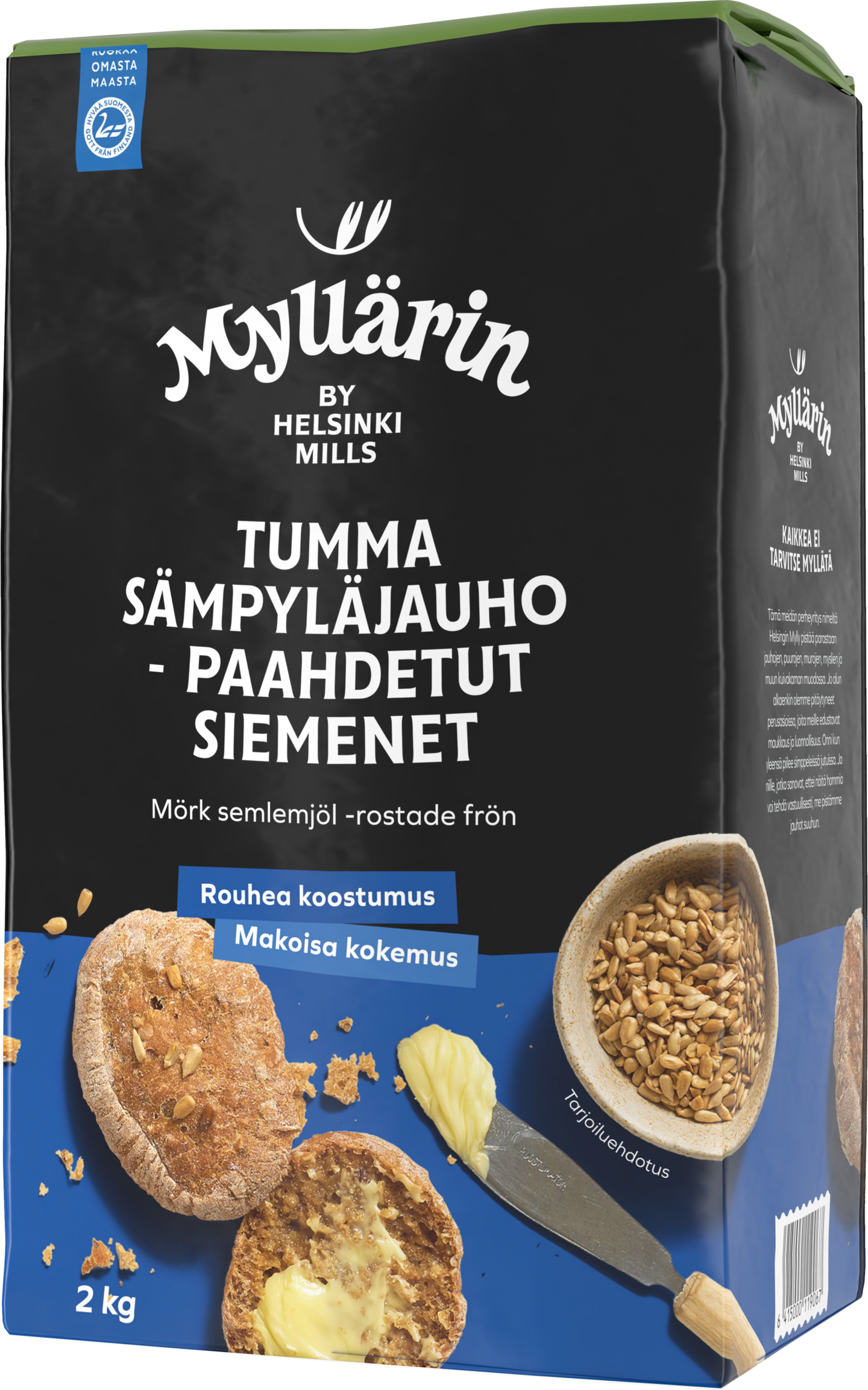Tumma Sämpyläjauho paahdetut siemenet on vehnä-, kaura- ja ruisjauhoseos, joka sisältää auringonkukansiemeniä ja paahdettua pellavansiemenrouhetta. Rouhea jauhoseos tarjoaa vaihtelua sämpylöiden ja leipien leivontaan ja jauhoseoksen sisältämät siemenet antavat sämpylöihin makua, rakennetta ja hyviä ravintoaineita. Tuotteella on Hyvää Suomesta Joutsenlippu -alkuperämerkki. Pakkauksen voi kierrättää keräyskartonkina.