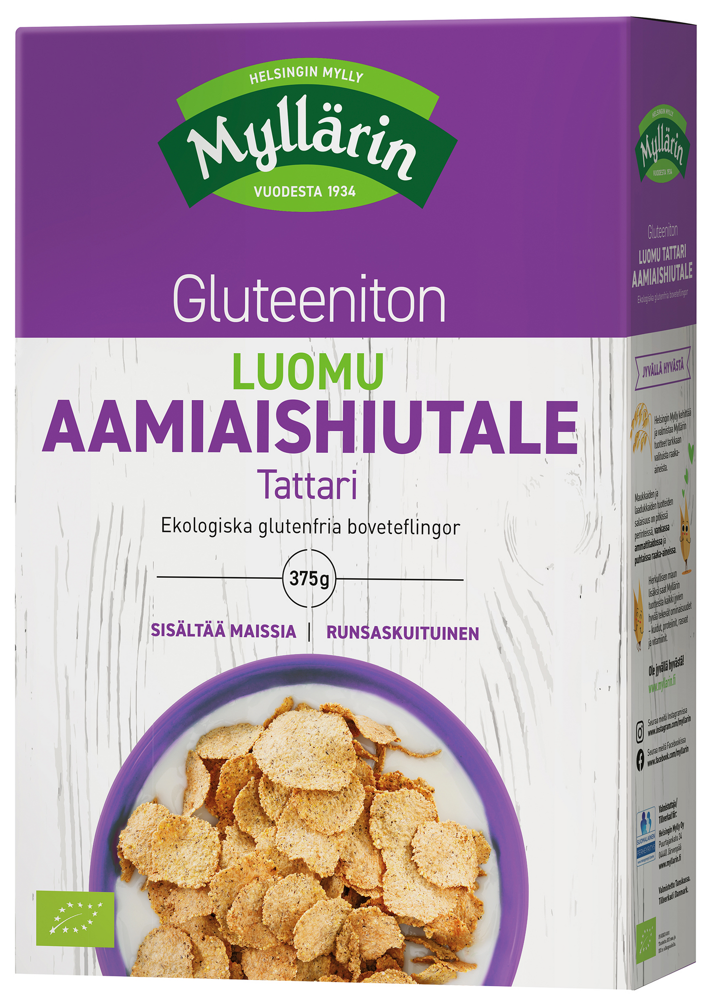 GluteenitonMyllärin gluteeniton, runsaskuituinen ja rapea aamiaishiutale maistuu aamu-, väli- ja iltapalana maidon tai jogurtin kanssa. Valmistettu maissista ja tattarista. Ulkopakkauksen voi kierrättää keräyskartonkina ja sisäpussin muovikeräykseen.