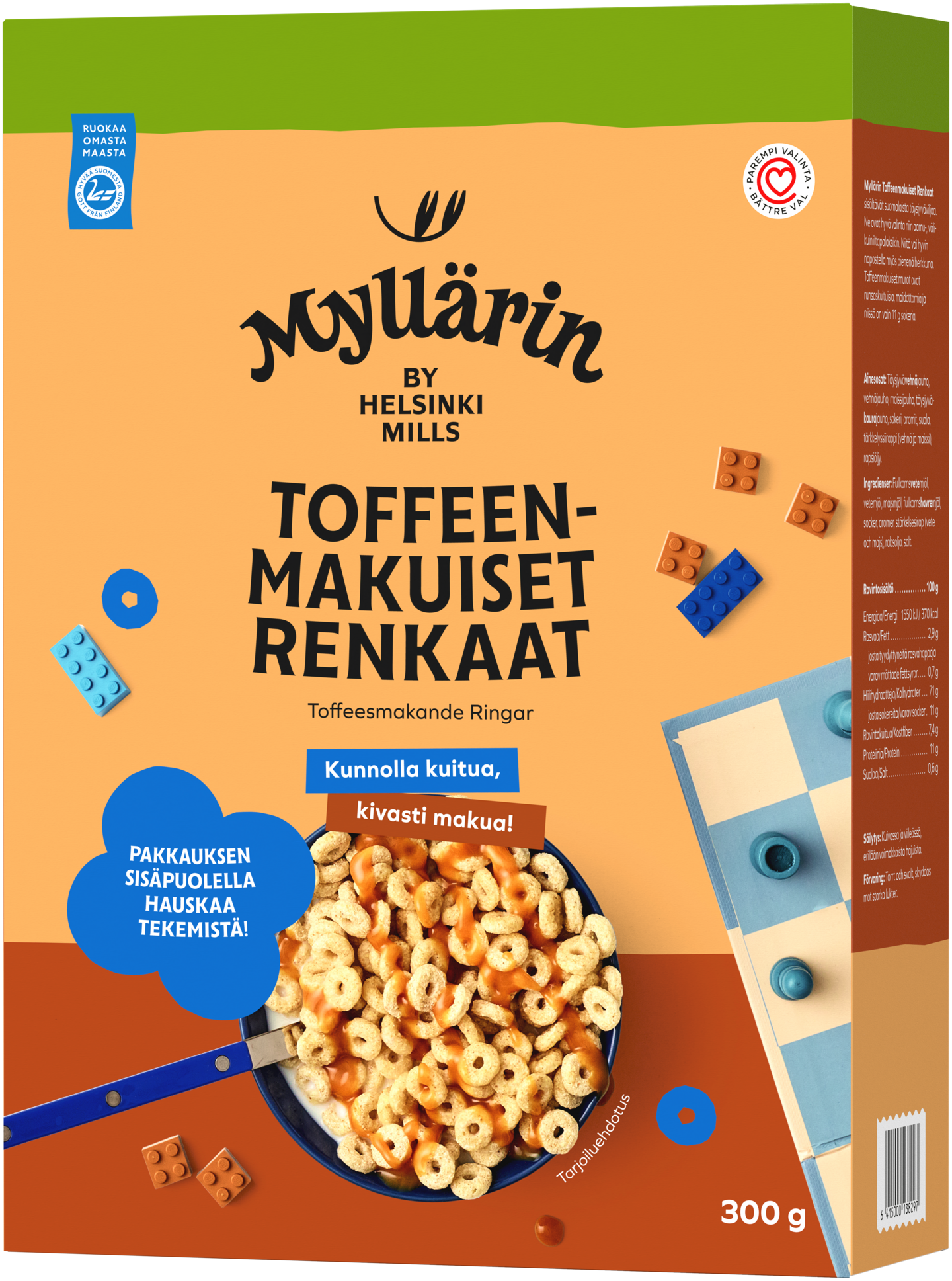 Myllärin Toffeenmakuiset Renkaat sisältävät suomalaista täysjyväviljaa. Ne ovat hyvä valinta niin aamu-, väli- kuin iltapalaksikin. Niitä voi hyvin napostella myös pienenä herkkuna. Toffeenmakuiset murot ovat runsaskuituisia, maidottomia ja niissä on vain 11 grammaa sokeria. Tuotteella on Hyvää Suomesta Joutsenlippu -alkuperämerkki sekä Sydänmerkki. Ulkopakkauksen voi kierrättää keräyskartonkina ja sisäpussin muovinkeräykseen.