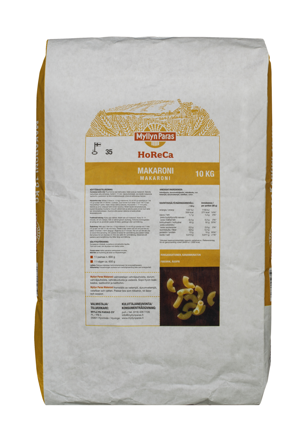 RunsaskuituinenMyllyn Paras Makaroni valmistetaan Suomessa vehnäjauhosta, durumvehnäjauhosta ja vehnäkuidusta. Muotona perinteinen sarvimakaroni. Sopii hyvin kaikkiin makaroniruokiin, esimerkiksi makaronilaatikkoon ja bolognesekastikkeen kanssa tarjoiltavaksi.