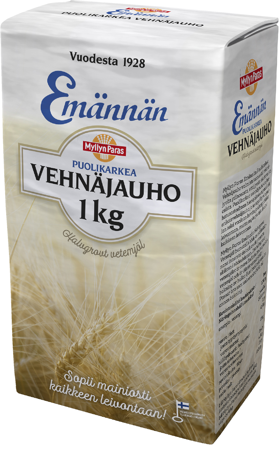 Myllyn Paras Puolikarkea Vehnäjauho valmistetaan Hyvinkäällä vehnänjyvän ydinosasta. Puolikarkea Vehnäjauho on jauhatusasteeltaan hienojakoisempaa kuin erikoisvehnäjauho ja se sopii hyvin hiivataikinoihin, joihin halutaan hyvä sitko. Myllyn Parhaan Puolikarkealla vehnäjauholla leivot esimerkiksi herkulliset pullat, sämpylät sekä vaalean leivän ja se sopii hyvin yleisjauhoksi kaikkeen leivontaan.