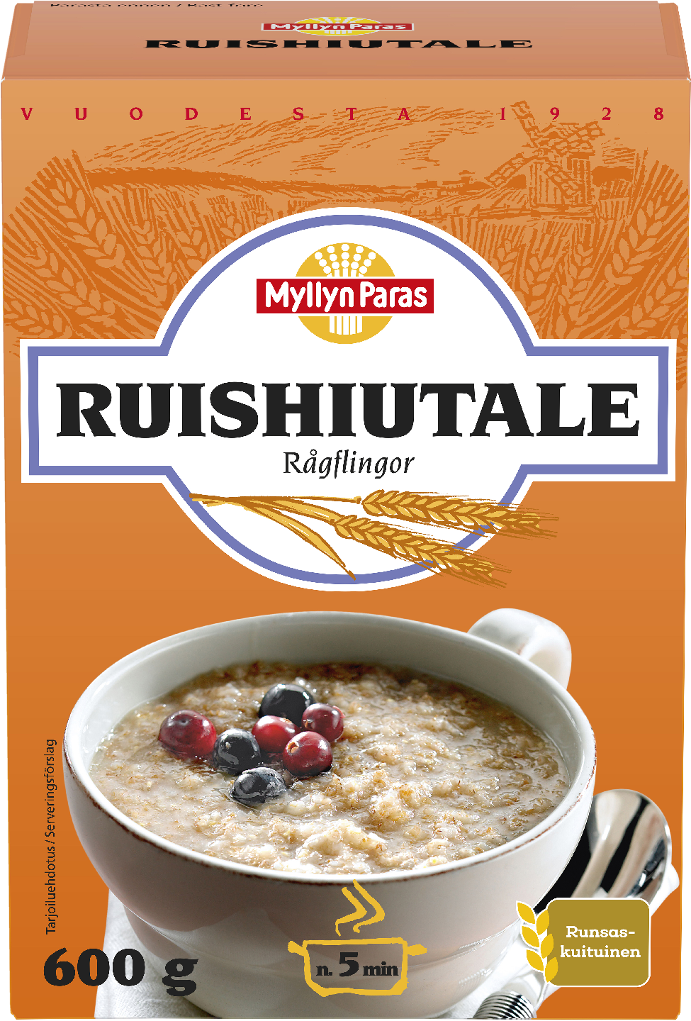 RunsaskuituinenMyllyn Paras Ruishiutaleet valmistetaan täysjyvärukiista, joka esikypsytetään, leikataan ja litistetänä ohuiksi hiutaleiksi. Ruishiutaleet sopivat puuroihin, leivontaan, mysleihin sekä sellaisenaan nautittavaksi esim. viilin tai jogurtin kanssa.