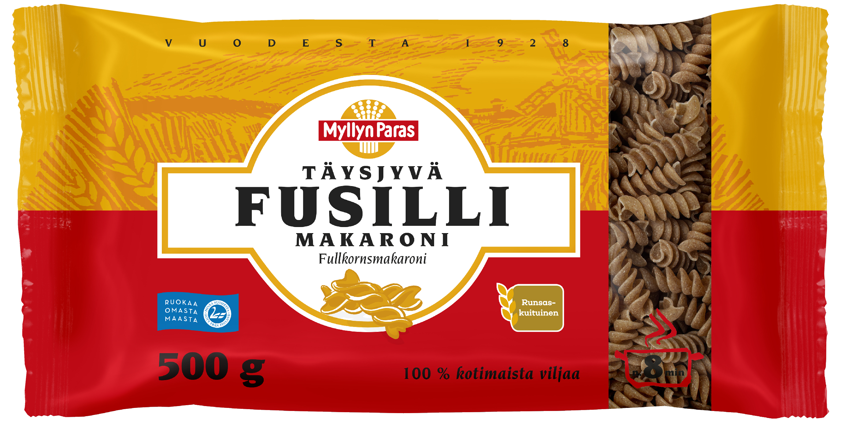 RunsaskuituinenMyllyn Paras Täysjyvä Fusilli Makaroni valmistetaan pääosin täysjyvävehnäjauhosta, jossa on mukana kaikki jyvän kuoriosan ravintorikkaat osat. Täysjyvä Fusilli Makaroni tuo ruokiin lisämakua ja on runsaskuituinen: kuitua on 8 %. Täysjyvä Fusilli Makaroni sopii hyvin sellaisenaan kastikkeen kanssa tarjoiltavaksi ja salaatteihin, paistoksiin, laatikoihin sekä keittoihin.