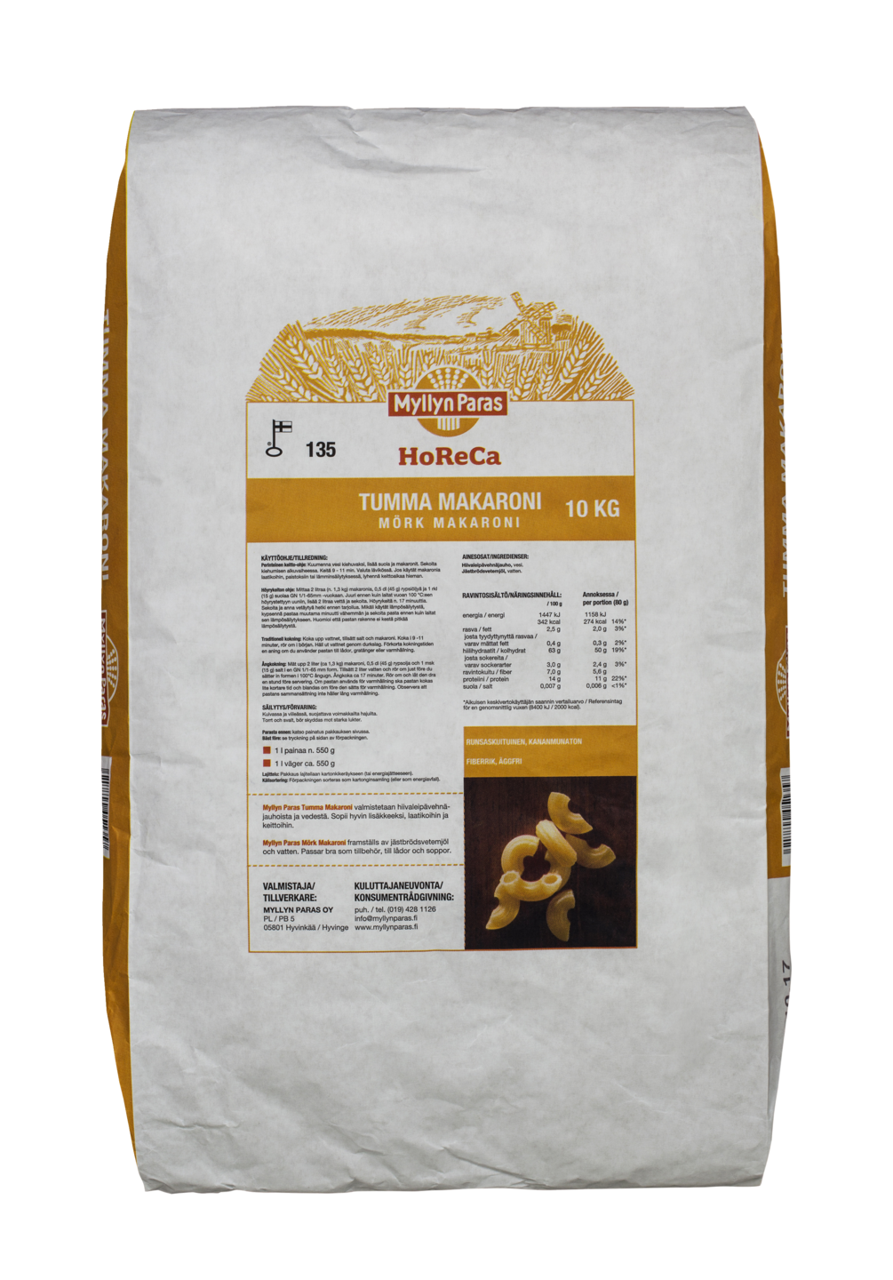 RunsaskuituinenMyllyn Paras Tumma Makaroni valmistetaan Suomessa hiivaleipävehnäjauhosta. Muotona perinteinen sarvimakaroni. Sopii hyvin kaikkiin makaroniruokiin, esimerkiksi makaronilaatikkoon ja bolognesekastikkeen kanssa tarjoiltavaksi.