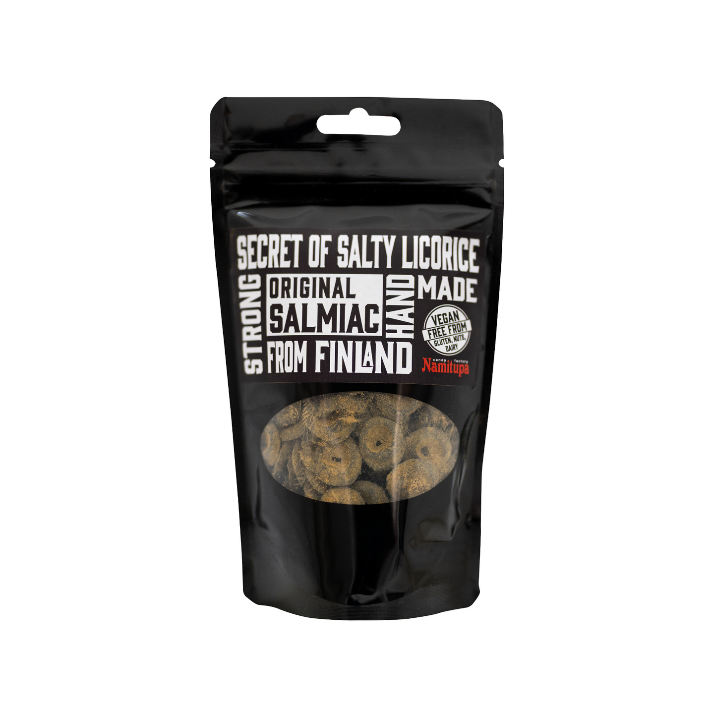 VegaaninenPerinteisten salmiakkinappien salaisuus on aidossa salmiakkisuudessa. Täydellinen määrä suolaisuutta pehmennettynä tipalla anisöljyä ja lakritsijauhehunnulla viimeisteltynä. Muotonsa puolesta herkullisesti rouskuteltavissa.