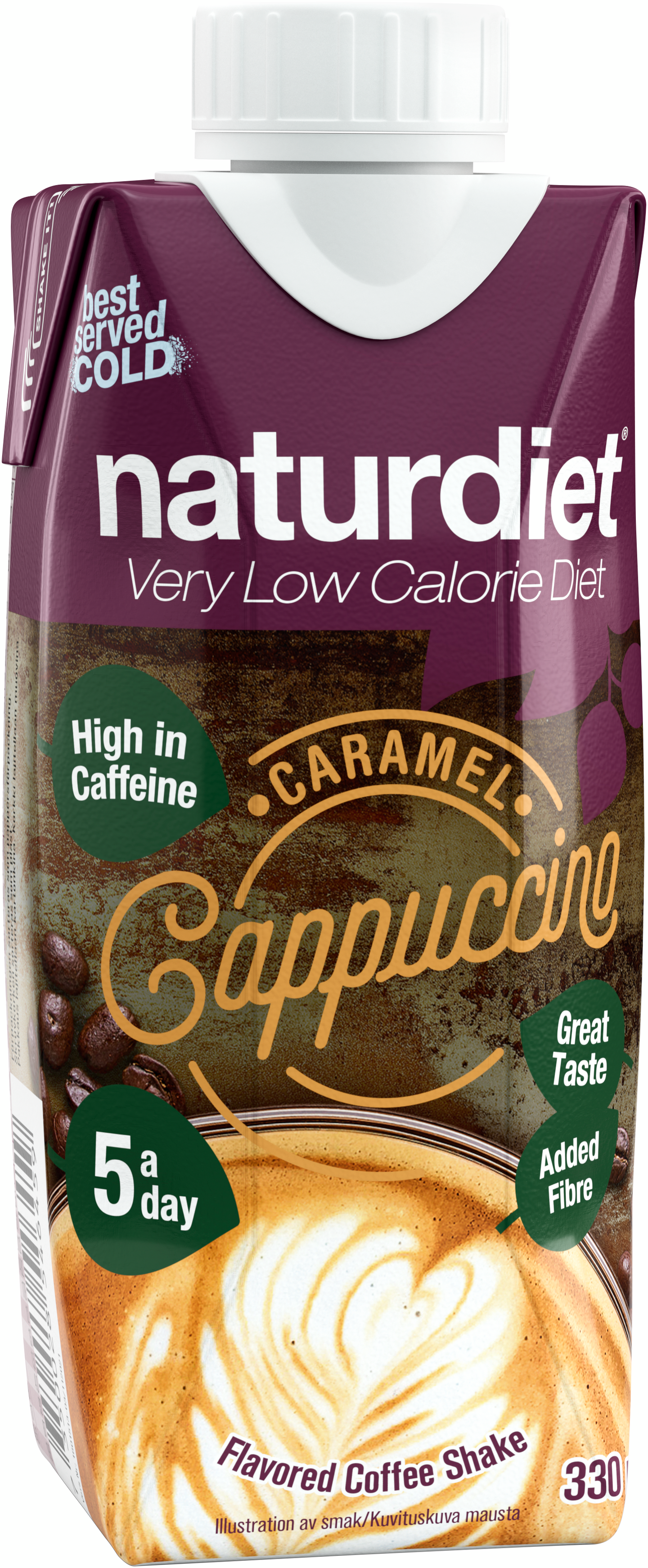 Naturdiet Proteiinikahvi Caramel Cappucino on hyvä ateriankorvike ja kahvi yhdessä ja samassa pakkauksessa. Se on luonnollisesti piristävä, johtuen korkeasta kofeiinipitoisuudesta. Proteiinikahvi on valmis nautittavaksi ja hyvä vaihtoehto makealle kahvijuomalle. Tuotetta voidaan käyttää korvaamaan kaikki ateriat (VLCD) tai ateriankorvikkeena muun ruokavalion ohessa (LCD), sillä se sisältää kaikki tärkeät vitamiinit ja kivennäisaineet, joita kehomme välttämättä päivittäin tarvitsee. Tuote sisältää paitsi runsaasti kuitua ja proteiineja, myös lisättyjä antioksidantteja.