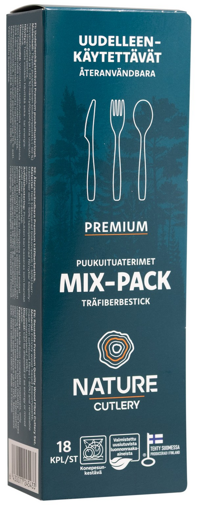 Nature Line -sarjan uudelleenkäytettävät Premium-aterimet on valmistettu uusiutuvasta ja kestävästä, täysin puupohjaisesta biokomposiitista. Ne tarjoavat vastuullisen vaihtoehdon fossiili- tai biopohjaisille kertakäyttöaterimille. Aterimet valmistetaan täysin puupohjaisista uusiutuvista raaka-aineista hyödyntäen metsäteollisuuden sivuvirtoja.