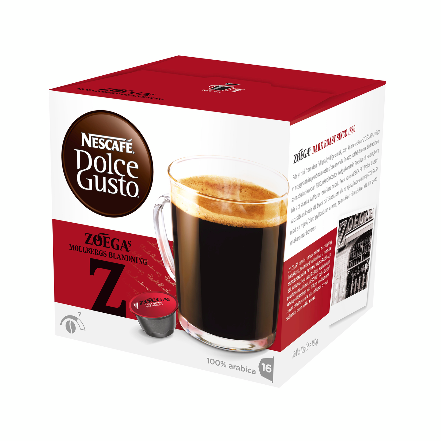 NESCAFÉ Dolce Gusto® ZOÉGAS Mollbergs -kahvikapselit perustuvat maineikkaaseen Zoégasin Mollbergs-kahvisekoitukseen joka kehitettiin 1900-luvun alussa Mollbergin Helsingborgin hotellin vieraita varten. Kenian ylängöillä kasvatettujen Arabica-papujen suuri osuus ja erityisen tumma paahto antavat ZOÉGAS Mollbergs -kahvikapselien maulle oman erityisen luonteensa. Tämän voimakkaan mutta elegantin kahvin vahvuus on 7/11, ja siinä voi havaita herukan ja toffeen vivahteita. Upea jälkimaku säilyy pitkään. Kenian sekä Väli- ja Etelä-Amerikan Arabica-pavut luovat Mollbergs Blandning -kahville sen kehutun täyteläisen ja intensiivisen maun. Nescafé Dolce Gusto - kahvilatason elämys kotonasi! Nescafé Dolce Guston kapselikeittimellä ja kapseleilla valmistat lempijuomasi käden käänteessä - vaivattomasti ja nopeasti. Valikoimasta löydät yli 30 erilaista kuumaa ja kylmää juomaa - nykylempparisi sekä uusia mielenkiintoisia tuttavuuksia. Ilmatiiviisti suljetut Nescafé Dolce Gusto -kapselit takaavat tuoreuden jokaisella kupillisellasi. Ole oman elämäsi barista ja tuo kahvilaelämys kotiisi! en jääkahvia, joka tarjoaa mieleenpainuvan makuelämyksen. Jokainen kahvi tarvitsee hieman erilaisen paahdon saavuttaakseen parhaan aromin, hapokkuuden, koostumuksen ja maun. Luokittelemme kahvimme kolmeen paahtoasteeseen, jotta oman suosikkisi löytäminen on helpompaa. Olemme 100% sitoutuneita eettiseen kahvintuotantoon yhteistyössä Conservation Internationalin kanssa. Suunniteltu NESCAFÉ ® Dolce Gusto ® -järjestelmälle.