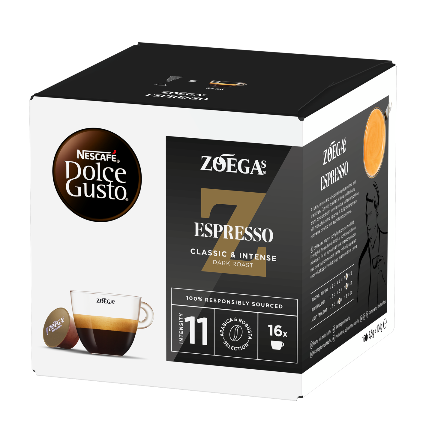 NESCAFÉ Dolce Gusto® Zoégas Espresso on tumma ja mausteinen espresso jossa voit aistia myös hasselpähkinän ja lakritsin vivahteita. Tämä hienostunut espresso on valmistettu paahteisista etiopialaisista ja kolumbialaisista premium Arabica-kahvipavuista, sekä vietnamilaisista Robusta-pavuista, ja kahvin vahvuus on intensiivinen 11/11.