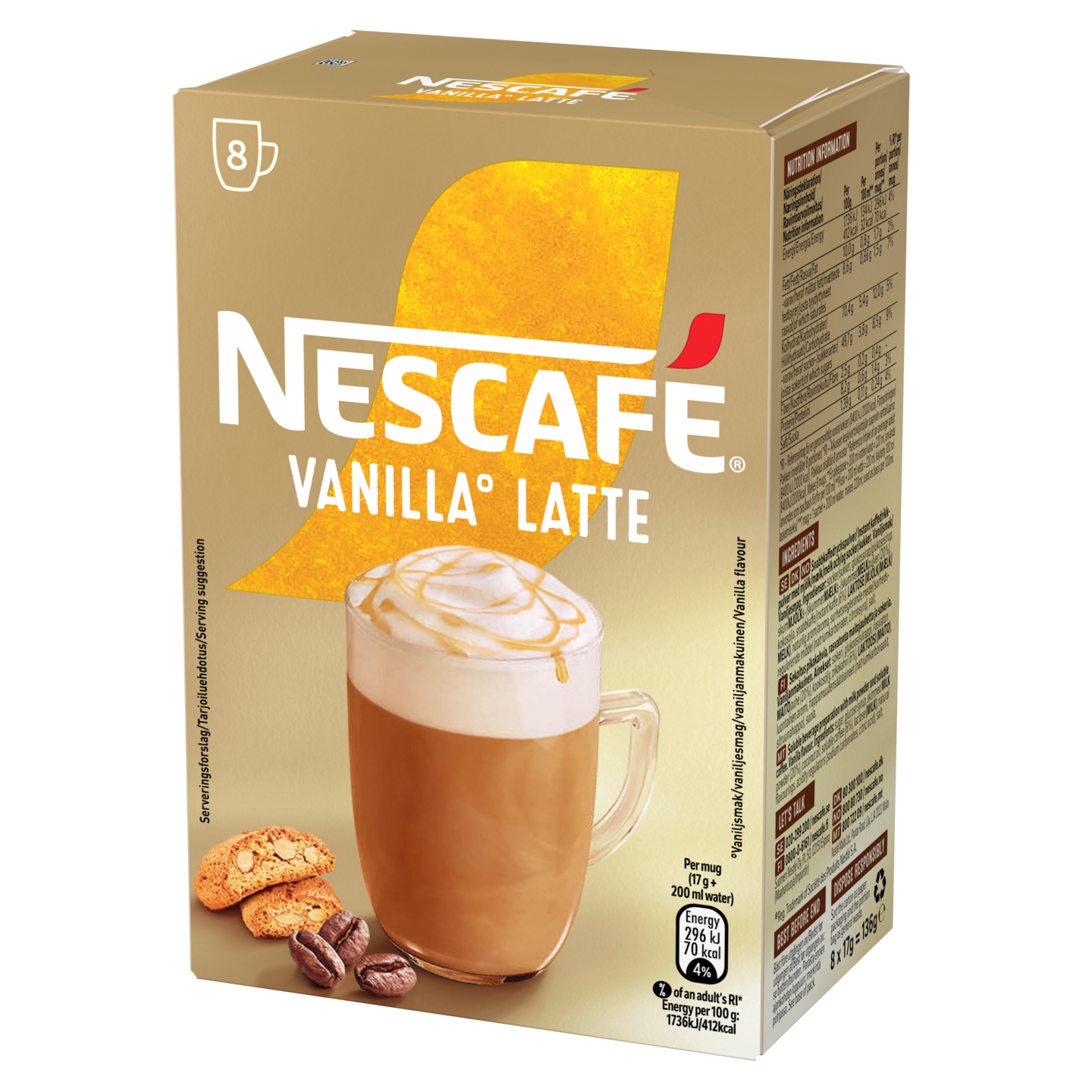 NESCAFÉ Vanilla Latte sisältää sekoituksen aromikasta kahvia, rasvatonta maitojauhetta ja sokeria – lisää vain vesi ja herkullinen vaniljalatte on valmis.