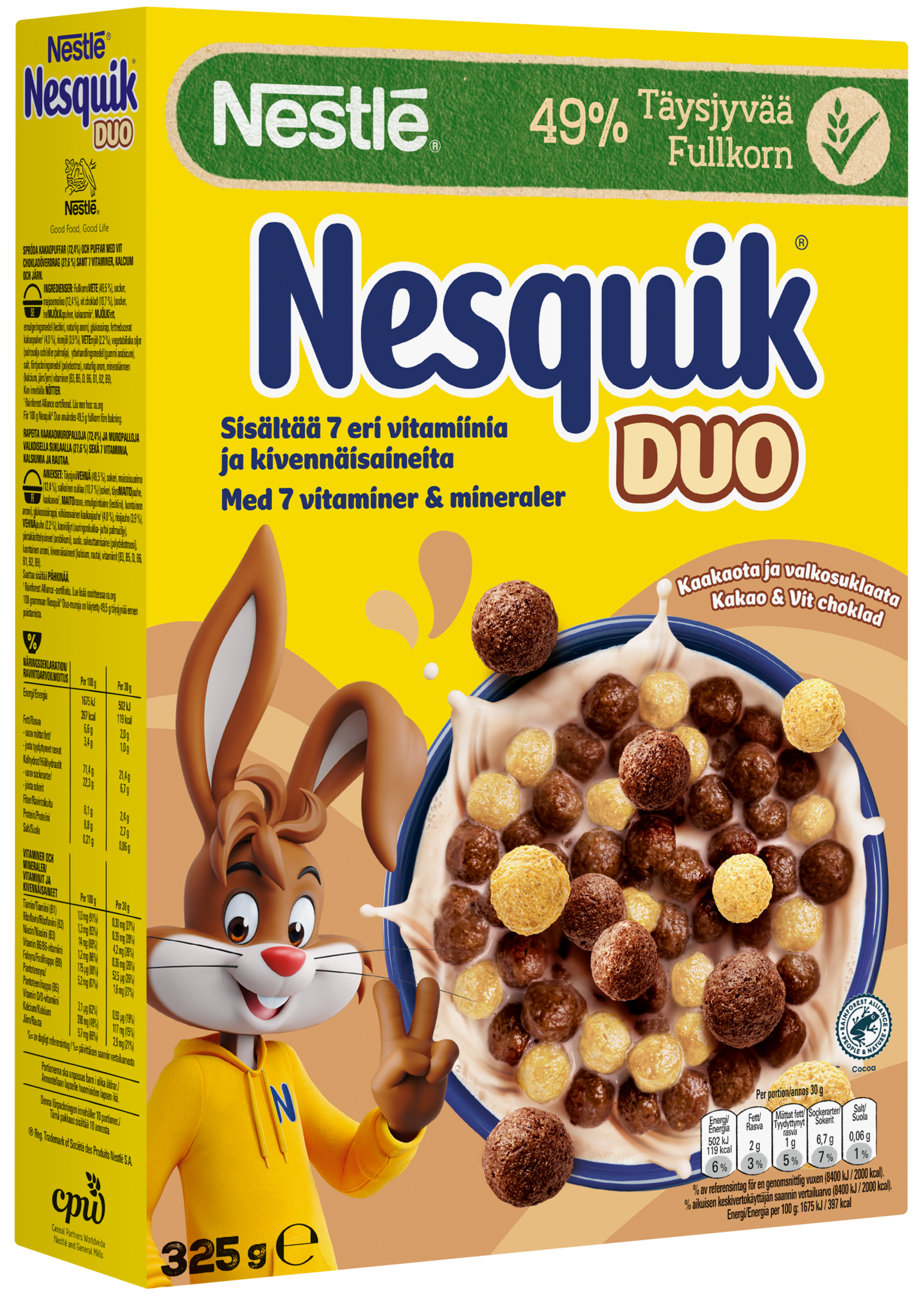 TäysjyväVEHNÄjauho (49,6%), sokeri, maissisuurimo (12,4%), valkoinen suklaa (10,7%) (sokeri, täysMAITOjauhe, kaakaovoi*, MAITOrasva, emulgointiaine (lesitiini), luontainen aromi), glukoosisiirappi, vähärasvainen kaakaojauhe* (3,9%), riisijauho (3,9%), VEHNÄjauho (2,2%), auringonkukkaöljy, kalsiumkarbonaatti, pintakäsittelyaineet (arabikumi, polydekstroosi), suola, luontainen aromi, rauta, vitamiinit (B3, B5, D, B6, B1, B2, B9). Saattaa sisältää PÄHKINÄÄ. *Rainforest Alliance -sertifioitu. Lue lisää osoitteessa ra.org