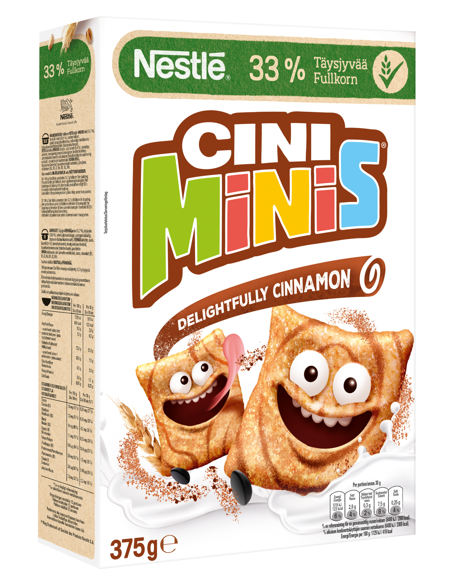 TäysjyväVEHNÄjauho (33,7 %), riisijauho (30,0 %), sokeri, glukoosisiirappi, auringonkukkaöljy, täyteaine (kalsiumkarbonaatti), VEHNÄtärkkelys, suola, kaneli (0,4 %), luontaiset aromit, emulgointiaine (lesitiini), hapettumisenestoaine (tokoferoliuute), paahdettu OHRAmallasuute, väri (annatto-norbiksiini), rauta, vitamiinit (B3, B5, D, B6, B1, B2, B9). Saattaa sisältää MAITOA ja PÄHKINÄÄ.