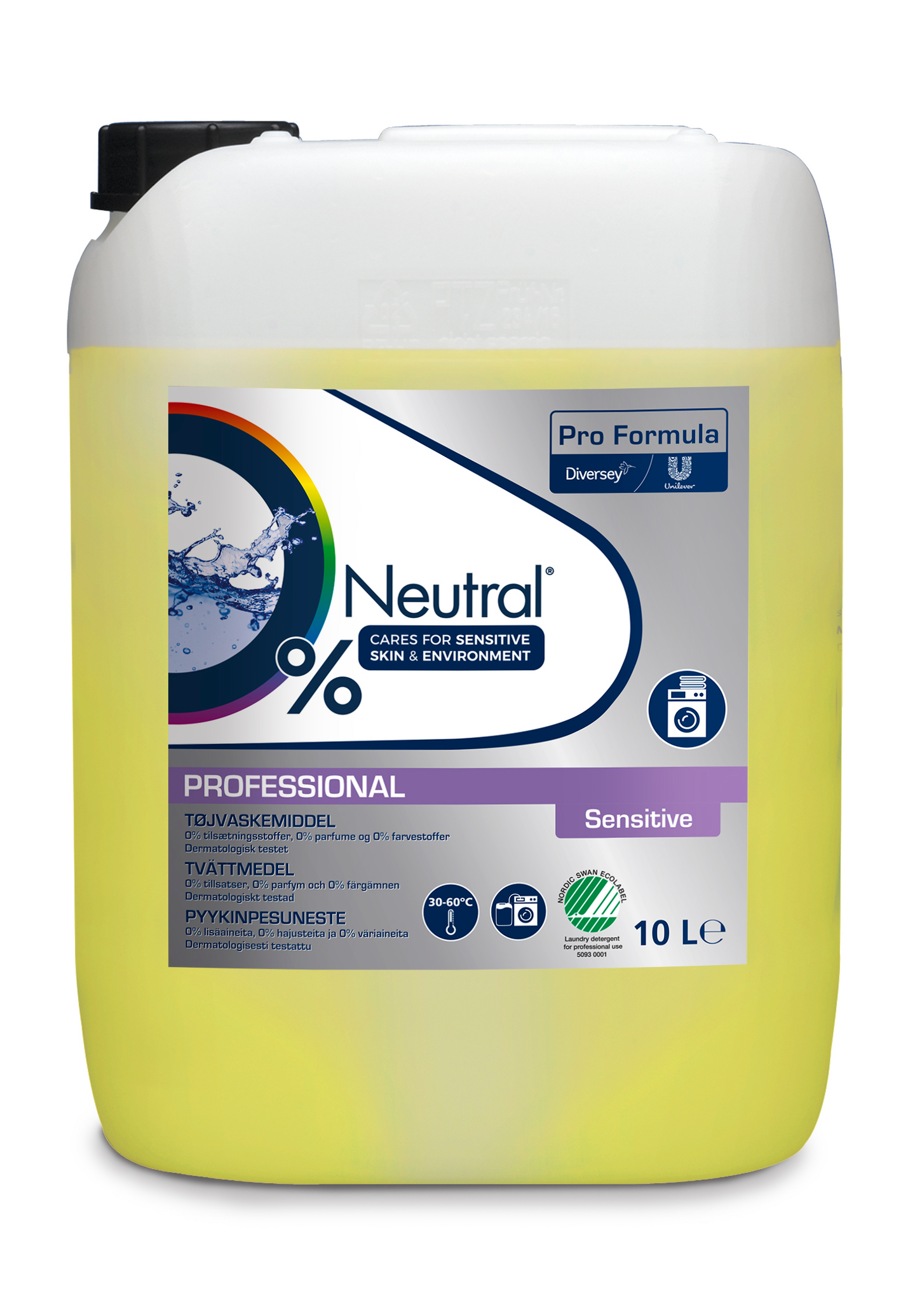 Neutral Professional Sensitive pyykinpesuaine on mieto nestemäinen pesuaine, joka auttaa vaatteita säilyttämään värinsä ja minimoimaan allergisten ihoreaktioiden riskiä. Neutral Professional Sensitive pyykinpesuaine on ympäristömerkitty pesuaine, joka on erityisesti kehitetty käytettäväksi kaupallisissa ja yrityskäytössä olevissa pesuloissa. Tuote soveltuu sekä automaattiseen että manuaaliseen annosteluun ja sitä voidaan käyttää kaiken kovuuden vesissä. Neutral Professional Sensitive pyykinpesuaine sopii kaikkien puuvilla- ja poly-puuvilla -kankaiden pesuun. Valkaisua/desinfiointia vaativissa tapauksissa Neutral Professional Sensitive pyykinpesuainetta tulee käyttää yhdessä matalan lämpötilan valkaisu-/desinfiointiaineen kanssa, jotta saavutetaan mahdollisimman suuri hyöty energian ja veden säästössä sekä liinavaatteiden käyttöiän pidentämisessä. Soveltuu erityisesti kiinteistöjen ja asuntoloiden pesuloihin. Ainoastaan ammattikäyttöön.
