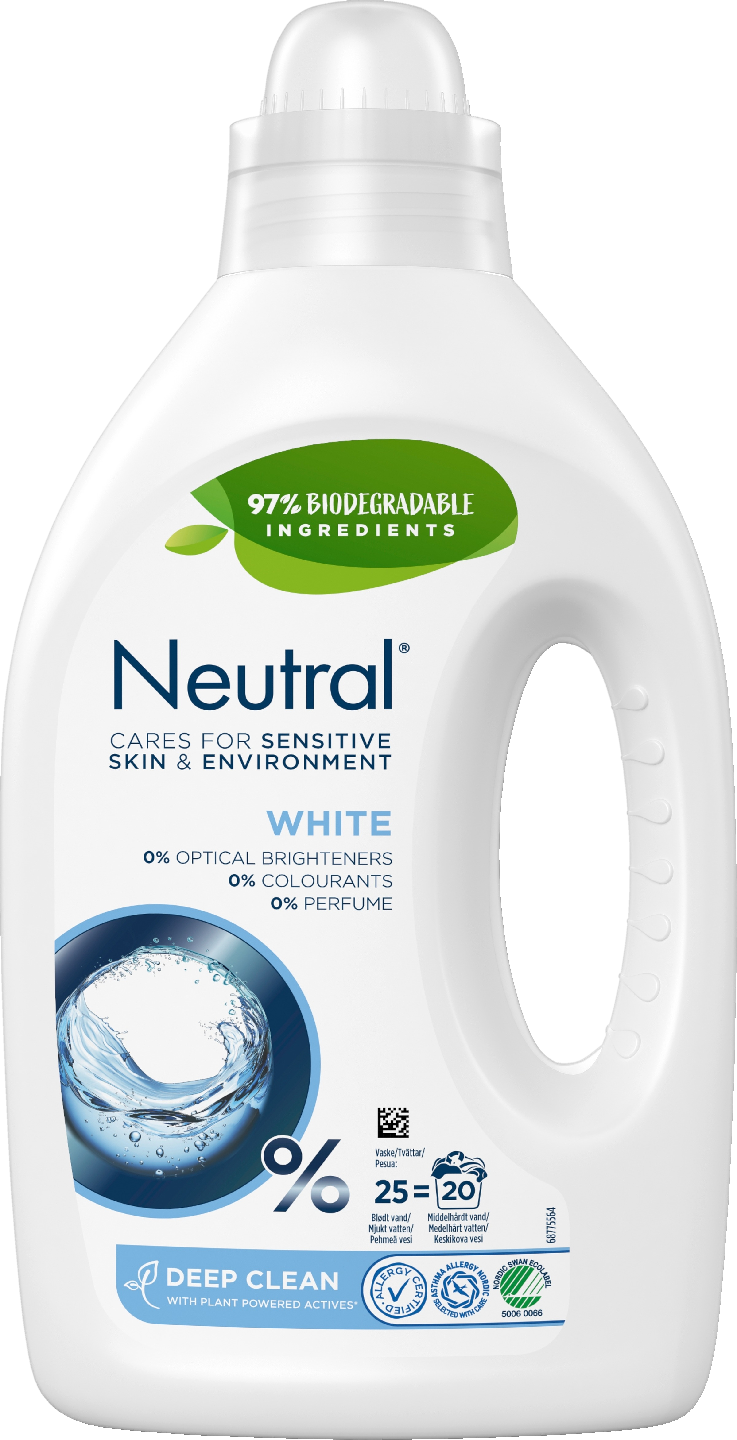 Neutral White on valkopyykille kehitetty pesuaine, joka on suunniteltu erityisesti herkälle iholle. Nestemäinen Neutral White -pesuaine on allergiaystävällinen, ei sisällä väriaineita tai hajusteita, mikä vähentää allergisia ihoreaktioita ja ihoärsytystä. Neutral White on pyykinpesuneste, joka poistaa tehokkaasti likaa ja tahroja. Neutral on kehitetty yhteistyössä kolmen pohjoismaisen Astma- ja allergiayhdistyksen (Asthma Allergy Nordic) kanssa. Sillä on Joutsenmerkki, joka on Pohjoismaissa käytettävä virallinen ympäristömerkki. Neutral White hajusteeton tarjoaa seuraavia etuja: • Poistaa tehokkaasti lian ja tahrat • Pesee puhtaaksi jo alhaisissa lämpötiloissa • Sopii konepesuun ja käsipyykille • Suunniteltu vähentämään allergisia ihoreaktioita • Hajusteeton ja väriaineeton • Dermatologisesti testattu • Ympäristömerkki eli Joutsenmerkitty • Neutral White säilyttää valkoiset vaatteet, lakanat, pyyhkeet jne. valkoisena pidempää. Kun peset kirjopyykkiä, käytä Neutral Colour nestemäistä pyykinpesuainetta. Se auttaa vaatteita säilyttämään värinsä pidempään – niin värillisiä kuin tummia tekstiilejä. Se on yhtä hellävarainen ja ihoystävällinen kuin Neutral White. Neutral-sarjasta löytyy paitsi pesuaineita ja huuhteluaineita, myös tuotteita henkilökohtaisen hygienian hoitoon, kuten suihkusaippua, shampoo ja ihovoide. Sarjassa on tuotteita myös lapsille ja vauvoille, kuten kosteusliina ja ihonhoitoöljy. Kaikki tuotteet ovat hajusteettomia ja väriaineettomia. Jokainen iho on erilainen, mikä tarkoittaa, että sama tuote ei sovi jokaiselle perheenjäsenelle. Tässä tulee Neutral avuksi. Tavoitteenamme on huolehtia koko perheen ihosta. Siksi tarjoamme monipuolisen valikoiman hellävaraisia tuotteita, jotka suojaavat ihoärsytykseltä. Alkaen normaalista ihosta herkkään ihoon, vauvan ihosta helposti ärsyyntyvään ja reagoivaan ihoon. Jokainen Neutral-tuote pesuaineesta käsirasvaan – ja kaikkeen siltä väliltä – auttaa sinua huolehtimaan ihostasi hellävaraisemmin joka päivä.