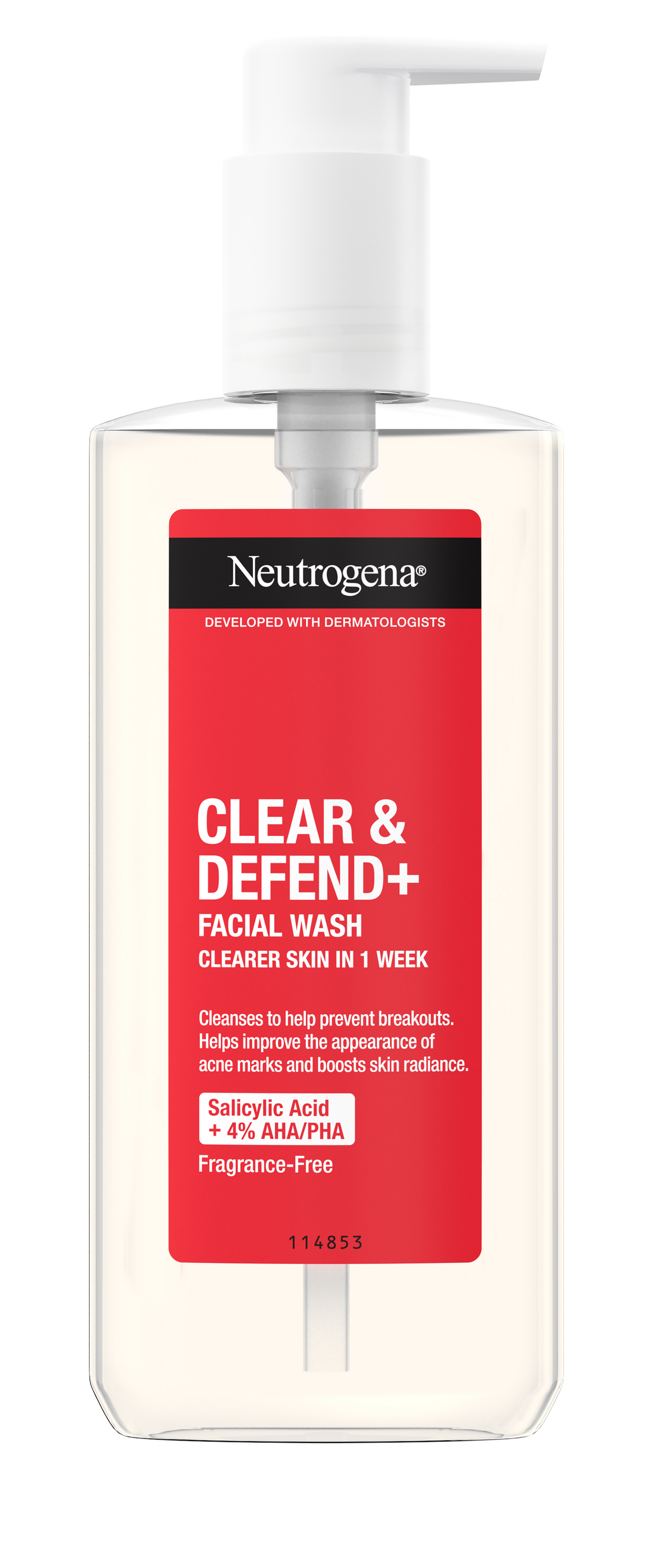 Hajustamaton Neutrogena® Clear & Defend+ Facial Wash -pesuneste puhdistaa kasvot ja auttaa ehkäisemään epäpuhtauksia. Se sisältää salisyylihappoa sekä tehokkaan 4 % yhdistelmän AHA- ja PHA-happoja: Kuoriva glykolihappo (2%), auttaa häivyttämään aknen jättämiä jälkiä ja glukonolaktoni (2 %) auttaa silottamaan ihoa. Öljytön, ihohuokosia tukkimaton koostumus. Terveemmän näköinen iho jo 1 viikossa! (Itsearviointi, 97 käyttäjää).
