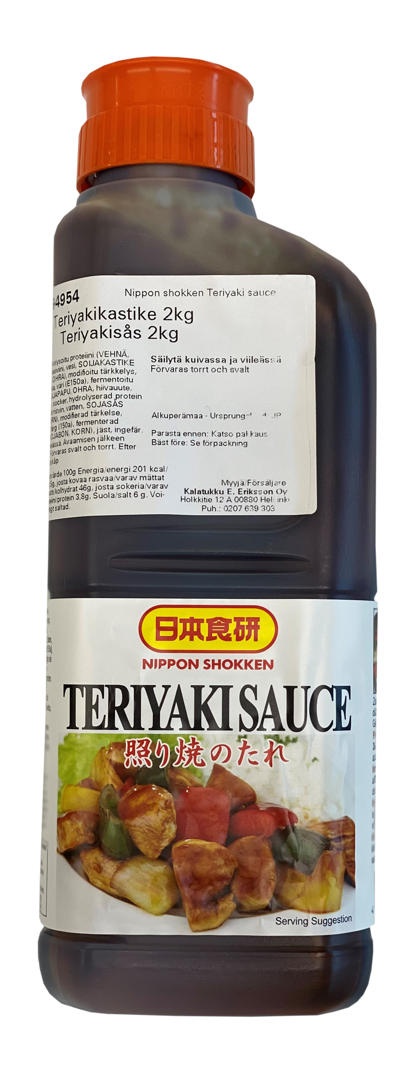 Sokeri, hydrolysoitu proteiini (VEHNÄ, SOIJAPAPU), mirin-maustekastike, vesi, SOIJAkastike (VEHNÄ, SOIJAPAPU, OHRA), modifioitu tärkkelys, ruskea sokerisiirappi, viinietikka, väri (E150a), fermentoitu SOIJAPAPUtahna (SOIJAPAPU, OHRA), hiivauute, inkivääri.