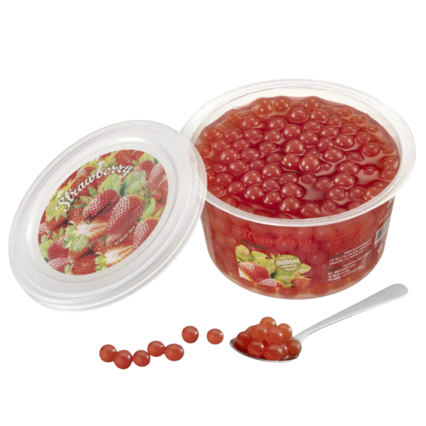 Mansikkamehulla täytetyt Bubble Tea helmet. Hedelmähelmet sopivat niin kylmiin kuin kuumiin juomiin, kokeile myös jäätelön tai jogurtin lisukkeena. Yhdestä pakkauksesta saa noin 10 annosta.