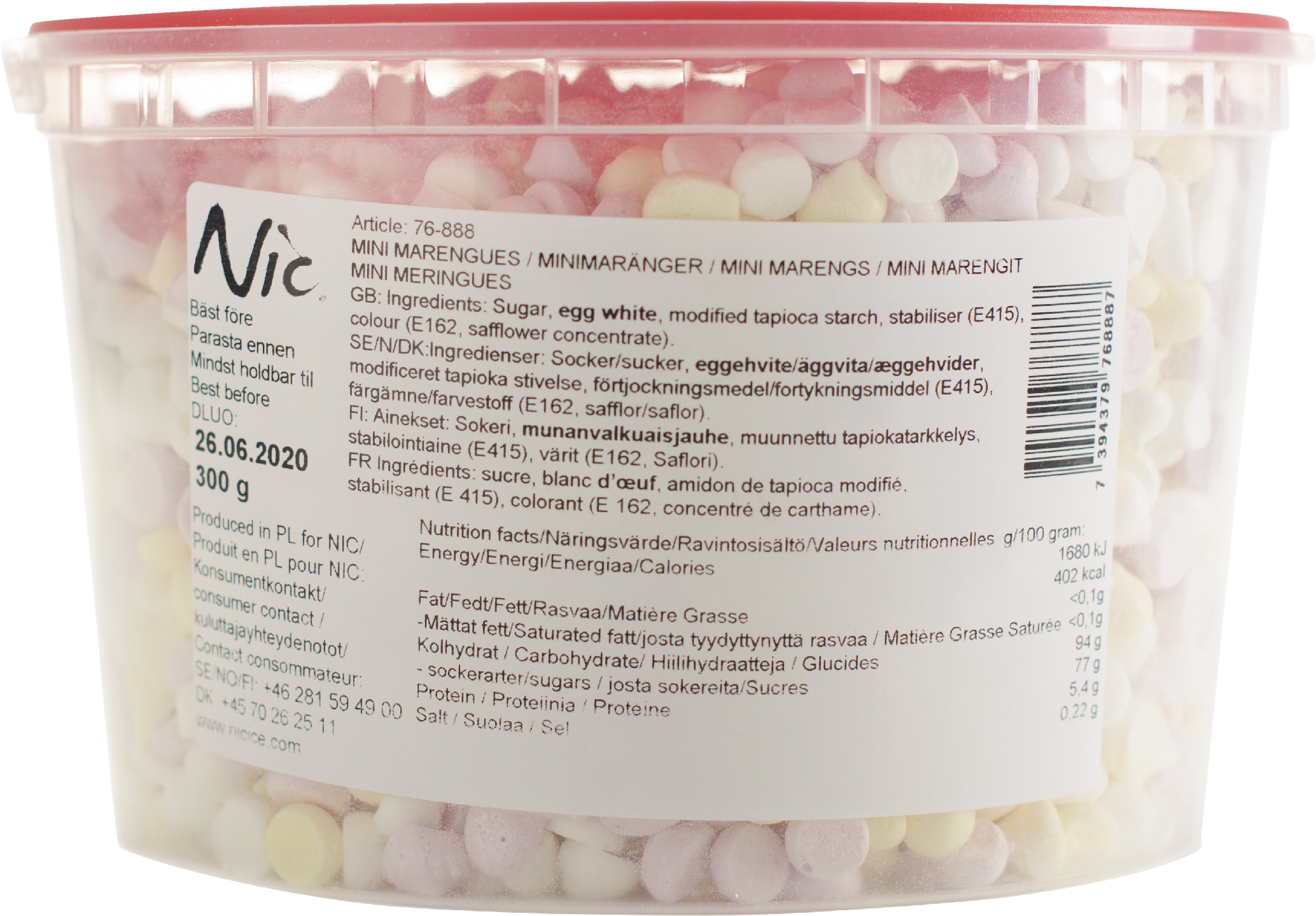 Sokeri, MUNANVALKUAISJAUHE, muunnettu tapiokatärkkelys, stabilointiaine (E415) ja värit (E162, saflori)