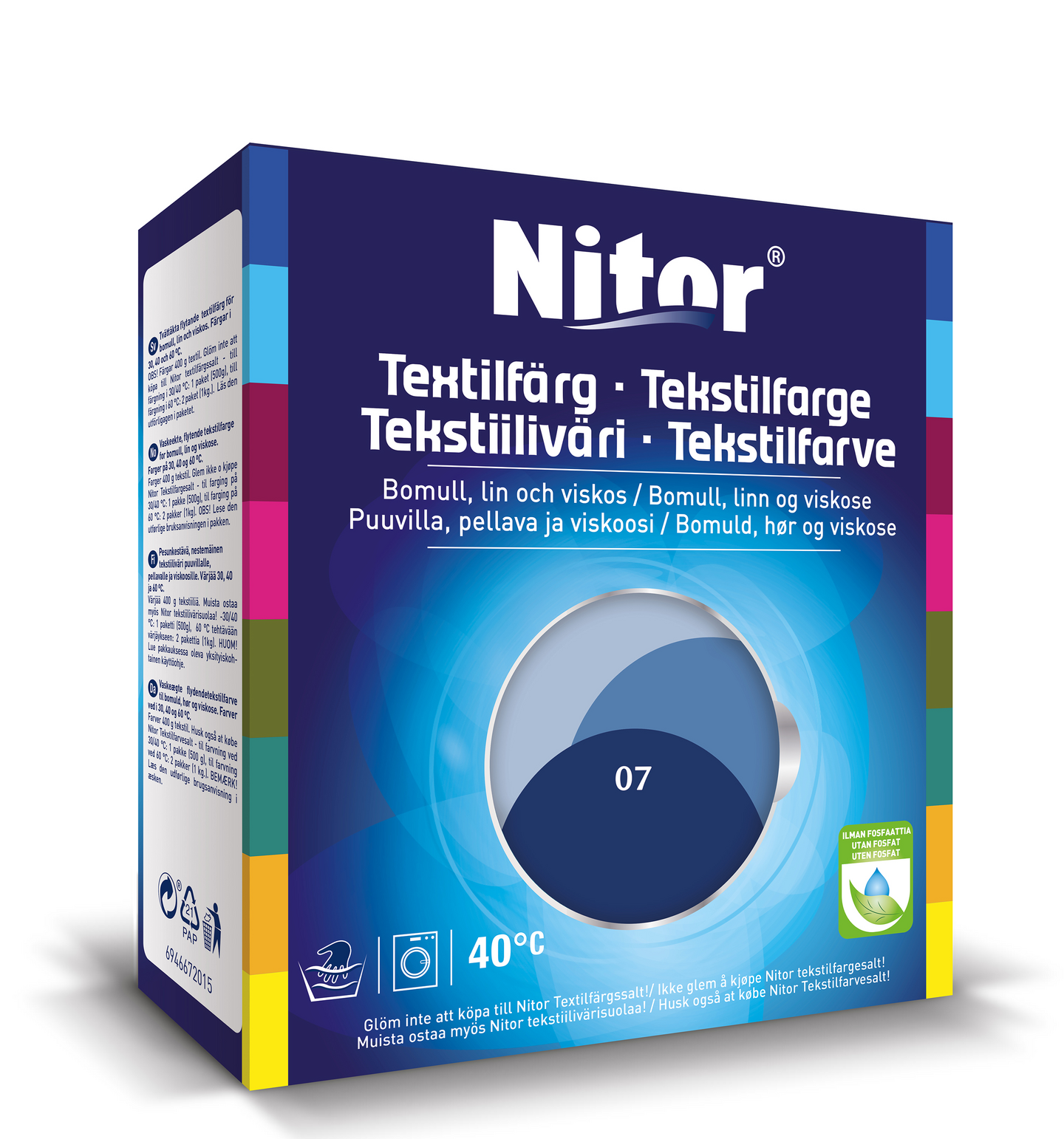 Nitor Tekstiiliväri sopii luonnonmateriaalien sekä selluloosakuitujen kuten puuvillan, pellavan, viskoosin, modaalin, raionin, kupron ja juutin värjäämiseen. Nitor Tekstiiliväripakkaus sisältää 75 ml väriainetta ja 100 g kiinnitysainetta. Yksi pakkaus riittää värjäämään 400 g kuivaa tekstiiliä. Värjäyksessä käytetään kiinnitteenä Nitor Tekstiilivärisuolaa. Värjättäessä 40°C:ssa tarvitaan 1 pkt Tekstiilivärisuolaa ja 60°C:ssa 2 pkt. Uudistettu - ei sisällä fosfaatteja.