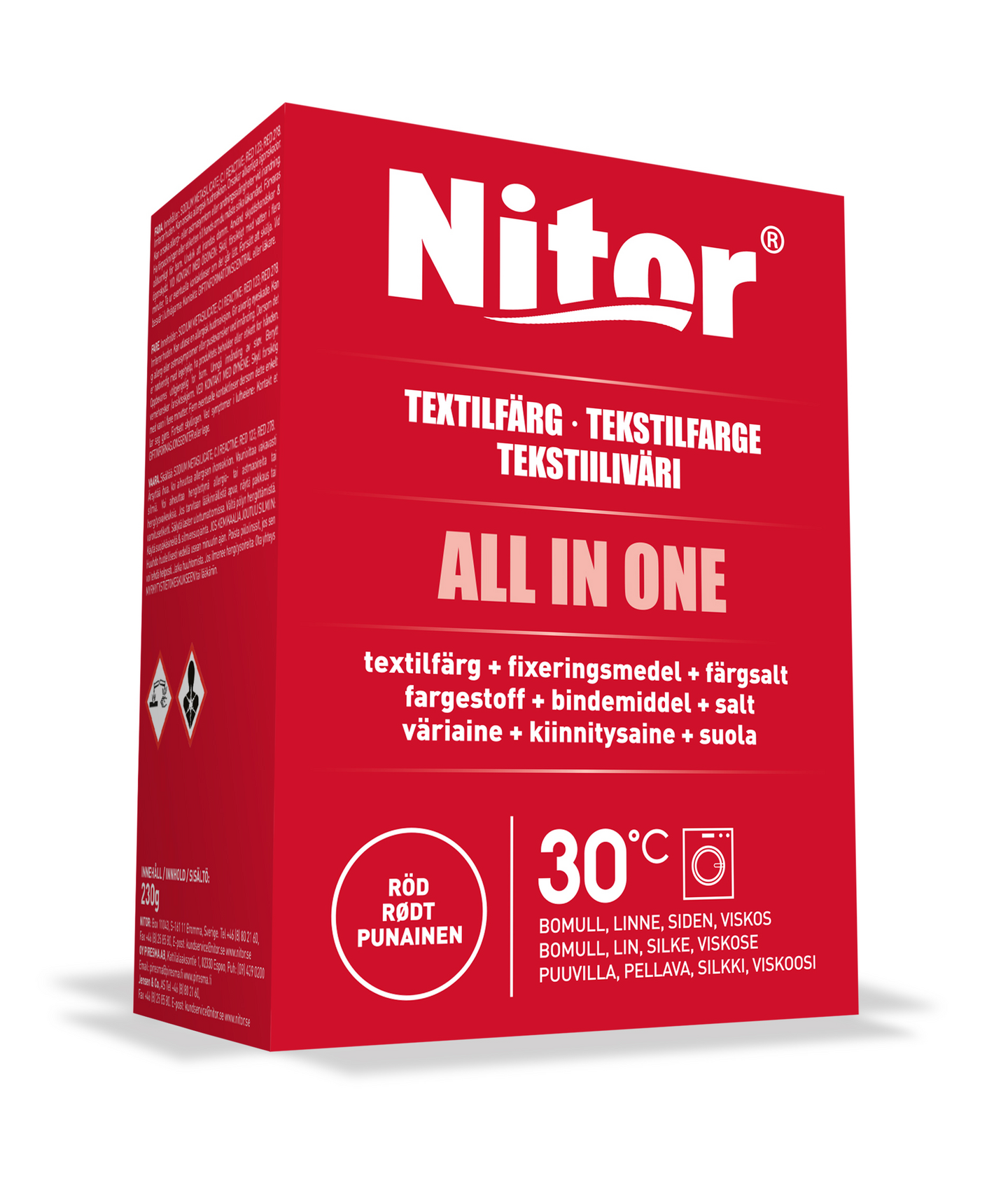 Soveltuu seuraavien kankaiden värjäämiseen: puuvilla, pellava, silkki, viskoosi, juutti, Tencel, Lyocell ja Modal. Nitor All in one -tekstiiliväripakkaus sisältää kaiken tarvittavan: väriaineen + kiinnitysaineen + suolan. 1 pakkaus Nitor All in one -tekstiiliväriä riittää värjäämään 200-600 g kuivaa tekstiiliä. Uudistettu - ei sisällä fosfaatteja.