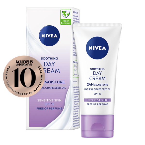 NIVEA Soothing Sensitive Day Cream SK15 -päivävoiteen erittäin hellävarainen koostumus antaa iholle rauhoittavaa kosteutusta 24 tunnin ajan. Sisältää: