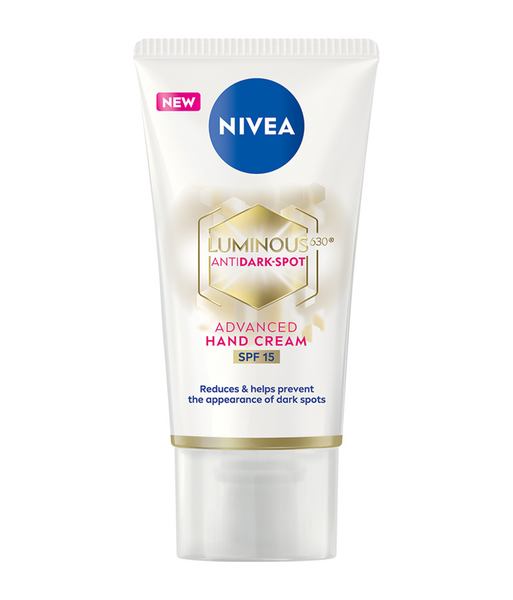NIVEA Luminous630® Anti Dark-Spot Hand Cream -käsivoide kosteuttaa kuivat kädet hetkessä! Innovatiivisen Luminous630-yhdisteen sisältävä voide vähentää ja ehkäisee tummia pigmenttiläiskiä tehokkaasti. Täyteläinen koostumus sisältää kosteuttavaa hyaluronihappoa ja ravitsee kuivaa käsien ihoa 24 tunnin ajan! Suojakerroin 15 auttaa suojaamaan käsiä pigmenttiläiskiltä ja auringon aiheuttamalta ihon ennenaikaiselta vanhenemiselta. Ei jätä tahmaista, eikä rasvaista tunnetta iholle. Tekee käsien ihosta tasaisen ja nuorekkaan näköisen. NIVEAn tutkijat tekivät 10 vuotta huolellista tutkimustyötä ja kävivät läpi yli 50.000 ainesosaa, löytääkseen erittäin tehokkaan LUMINOUS630:n, joka vaikuttaa solutasolla. Päivittäiseen käyttöön sopiva kätevä tuubipakkaus kulkee helposti mukana vaikka laukussa. *in-vitro.