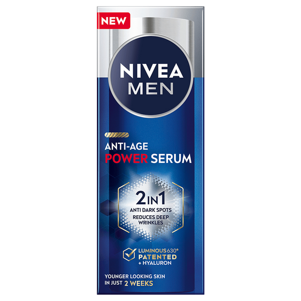 NIVEA MEN Anti-Age 2in1 Power Serum kasvoseerumi yhdistää hyaluronihapon ja patentoidun pigmenttiläiskiä vähentävän ainesosan Luminous630®N tarjoten edistyksellisen pigmenttiläiskien vähenemisen ja anti-age-vaikutuksen iholle. Ehkäisee pigmenttiläiskien syntymistä ja vähentää läiskien kokoa ja intesiteettiä. Tekee ihosta nuoremman näköisen van 2 viikossa. Seerumin koostumus on erittäin kevyt ja nopeasti imeytyvä. Antaa 24 tuntia kosteutusta iholle.