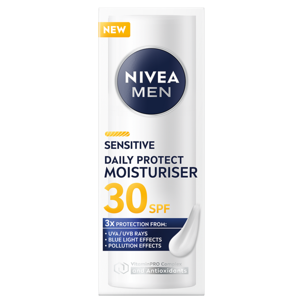 NIVEA MEN Sensitive Daily Protect Moisturiser SK 30 -kasvovoiteen kevyt koostumus imeytyy nopeasti ja antaa iholle välittömän tehokosteutuksen. Erityisesti herkälle iholle kehitetty voide suojaa ihoa UVA/UVB-säteilyltä suojakertoimella 30. Ei jätä rasvaista tunnetta iholle. Antaa iholle vahvan kolminkertaisen suojan: UVA/UVB-säteiltä, Sinivalon vaikutuksilta, Ilmansaasteilta