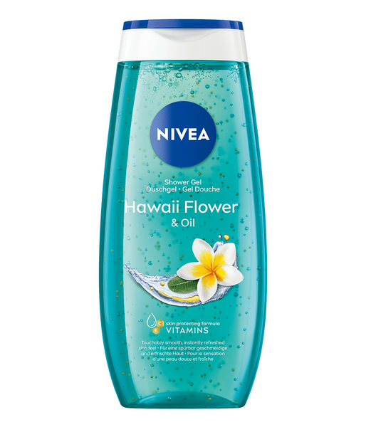NIVEA Hawaii Flower & Oil Shower -suihkugeelin C-vitamiinia, E-vitamiinia ja öljyhelmiä sisältävä frangipani-kukan tuoksuinen virkistävä koostumus suojaa ihoa kuivumiselta! Houkutteleva yhdistelmä raikkautta ja hemmottelevaa hoitoa. Raikas havaijilaisen frangipani-kukan tuoksu tekee suihkuhetkestä herkullisen. E-vitamiini kosteuttaa sekä suojaa ihoa ja sen luonnollista rakennetta. Olo on virkistynyt ja raikas! Neutraali pH-arvo iholle, toimii tasapainossa ihon oman mikrobiomin kanssa. Nauti ihanasta raikkaudesta, joka kestää. Dermatologisesti testattu. Ei sisällä mikromuovia. Pakkaus on kierrätettävä. Suihkugeelin koostumus on 99% biohajoava* ja pullo on valmistettu 96% kierrätysmuovista**.