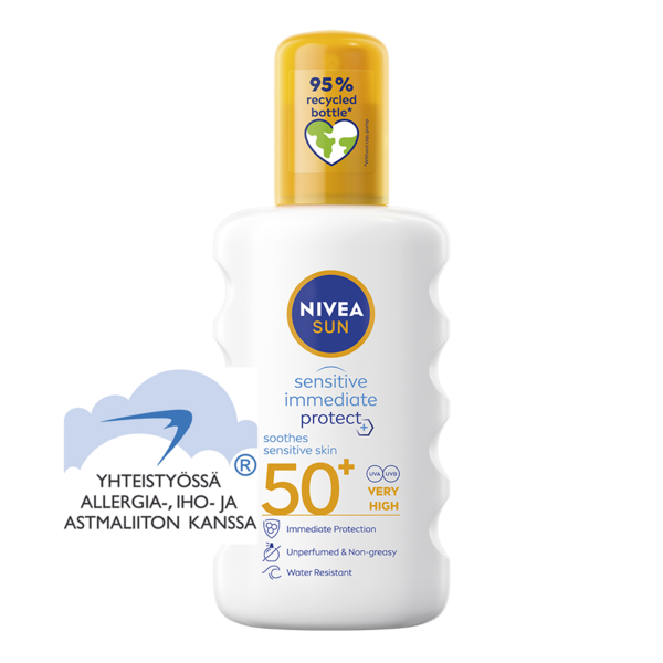 NIVEA SUN Sensitive Immediate Protect Soothing Sun Spray SK50+ -aurinkosuojasuihkeessa on erittäin korkea suojakerroin SK50+! Tuote suojaa UVA- ja UVB-säteilyä vastaan, sekä ehkäisee auringonpolttamia ja ihon ennenaikaista ikääntymistä. Tuotteen luomu aloe vera ja jojobaöljy rauhoittavat ihoa ja on kehitetty erityisesti herkälle iholle. Aloe vera rauhoittaa ja jättää ihon virkistyneeksi ja pehmeäksi. Jojobaöljy on erinomainen kosteuttaja, koska se muistuttaa ihon omaa talia, mutta ei tuki ihohuokosia tai jätä rasvaisia jäämiä iholle. Nauti auringosta ja ulkoilmasta turvallisesti ärsyttämättä herkkää ihoasi! NIVEA SUN -tuotteilla voit olla huoletta auringolta suojattuna. Vedenkestävä koostumus. Tuotteelle on myönnetty Allergia-, Iho- ja Astmaliiton Allergiatunnus! Dermatologisesti testattu.