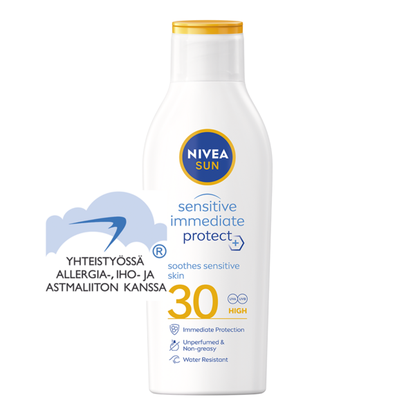 NIVEA SUN Sensitive Immediate Protect Soothing Sun Lotion SK30 -aurinkosuojavoide sisältää tehokkaita UVA/UVB-suodattimia, jotka antavat välittömän suojan iholle. Kehitetty erityisesti herkälle iholle. Antaa luotettavan ja pitkäkestoisen suojan palamiselta ja ehkäisee ihon ennenaikaista vanhenemista. Sisältää Aloe Veraa ja jojobaöljyä. Aloe vera rauhoittaa ihoa ja jättää sen virkistyneeksi ja pehmeäksi. Jojobaöljy on erinomainen kosteuttaja, koska se muistuttaa ihon omaa talia, mutta ei tuki ihohuokosia tai jätä rasvaisia jäämiä iholle. Vedenkestävä ja hajusteeton koostumus, joka imeytyy nopeasti. NIVEA SUN -tuotteilla voit olla huoletta auringolta suojattuna. Tuotteelle on myönnetty Allergia-, Iho- ja Astmaliiton Allergiatunnus! Dermatologisesti testattu.
