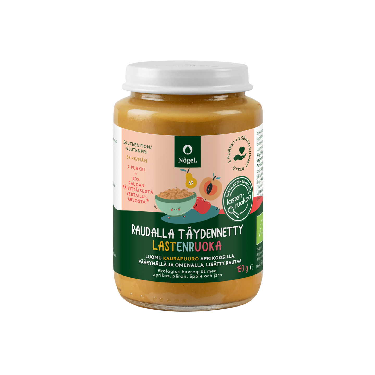 Nôgel luomu kaurapuuro aprikoosilla, päärynällä ja omenalla, lisätty rautaa 190 g 6kk +