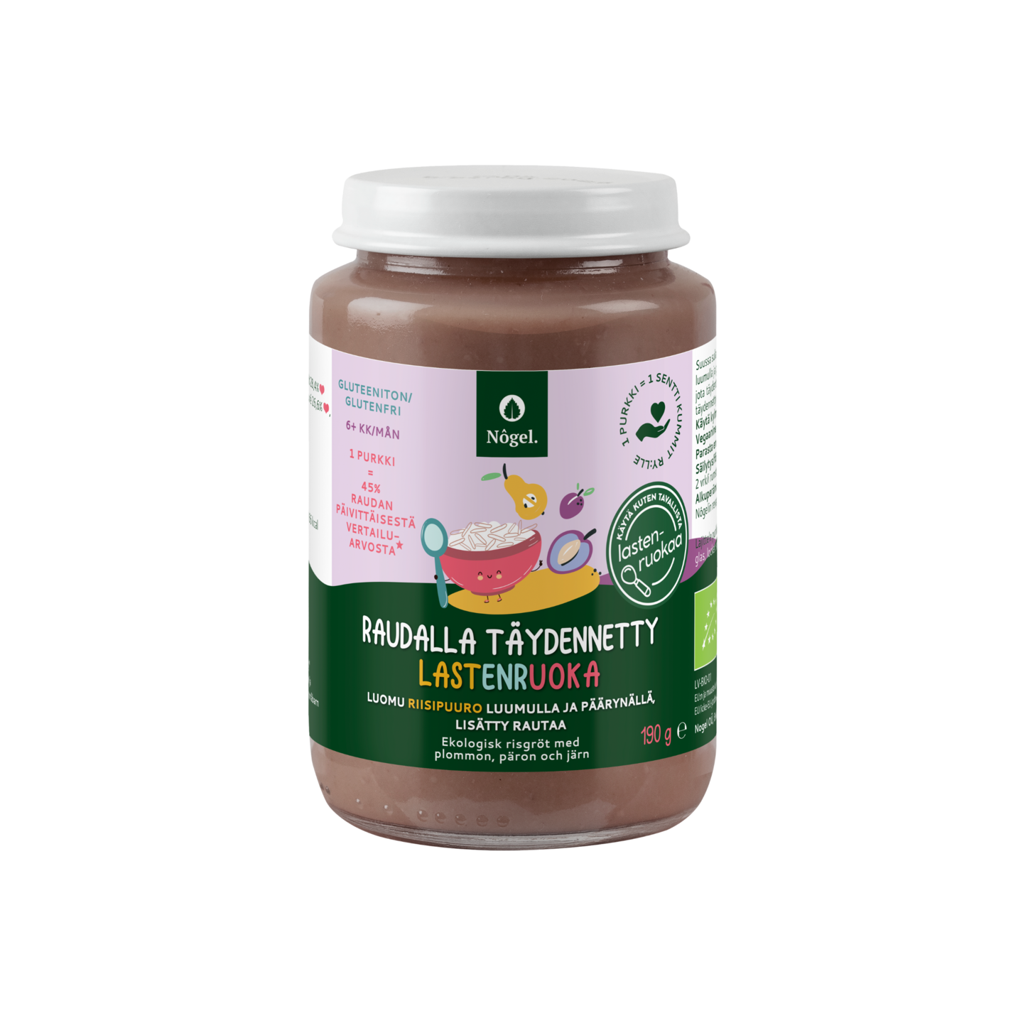 Nôgel luomu riisipuuro luumulla ja päärynällä, lisätty rautaa 190 g 6kk +