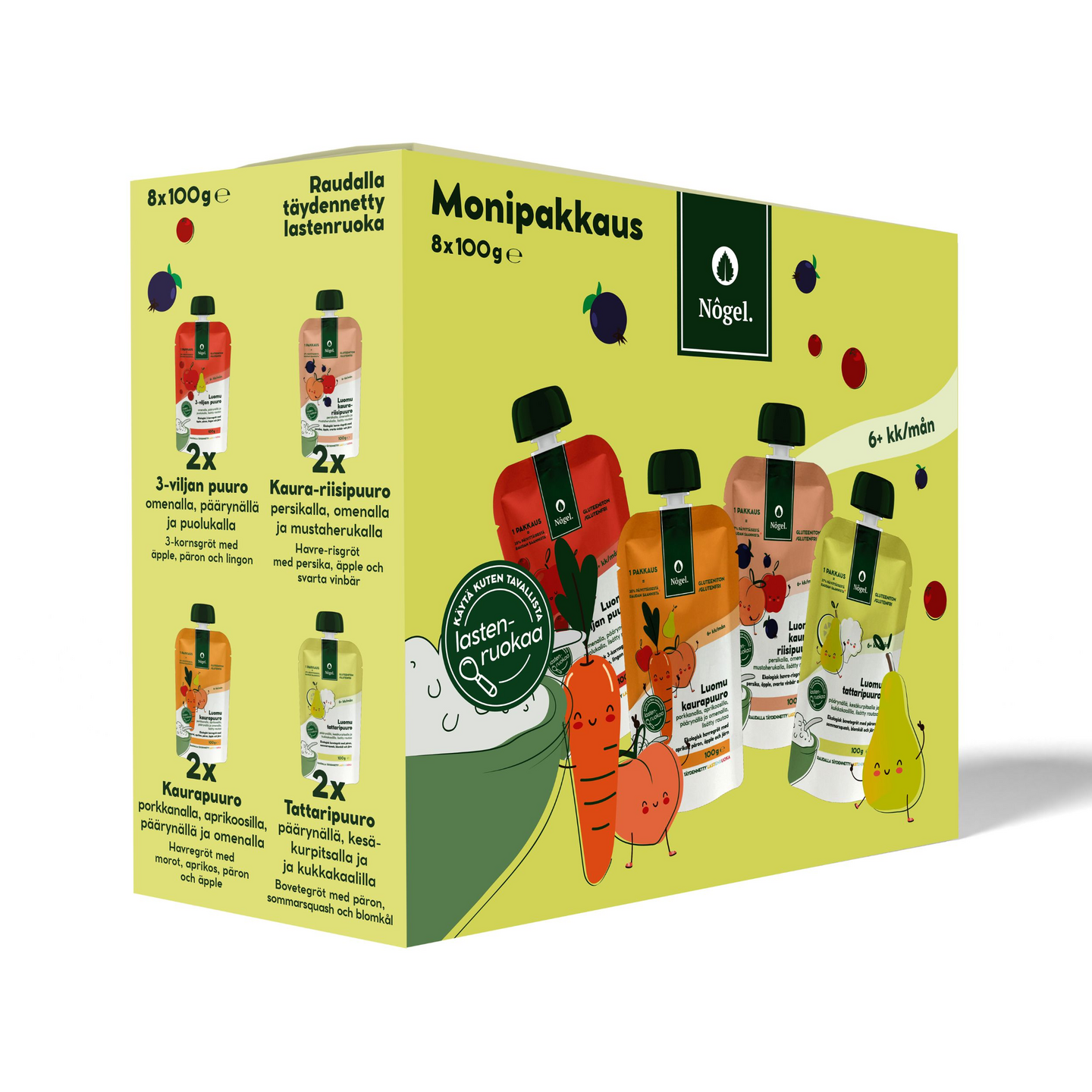 Nôgel välipalapuuro tattaripuuro, 3-viljapuuro, kaura-riisipuuro, kaurapuuro 8 x 100g luomu