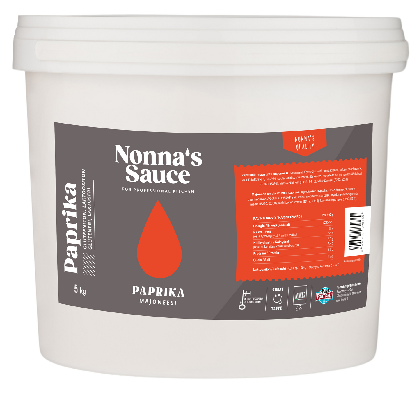 Rypsi-rapsiöljy, vesi, tomaattisose, sokeri, paprikajauhe, KELTUAINEN, SINAPPI, suola, etikka, muunnettu tärkkelys, mausteet, happamuudensäätöaineet (E260, E330), stabilointiaineet (E412, E415), säilöntäaineet (E202, E211).