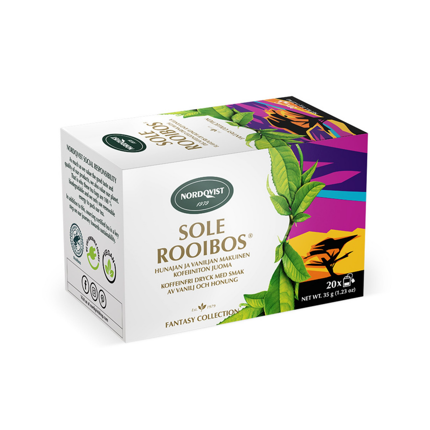 Kofeiiniton vaniljan ja hunajan aromeilla maustettu rooibos, jossa lisänä auringonkukanlehtiä.