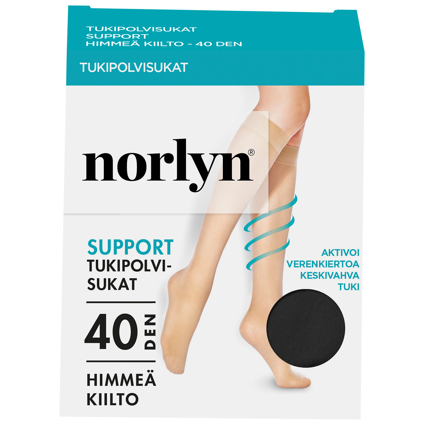 Norlynin 40 denierin himmeäkiiltoiset jalkoja virkistävät tukipolvisukat keskivahvalla tuella. Leveä ja sileäpintainen resori. Huomaamaton kärkivahvike. Koostumus: 85% polyamidi, 15% elastaani