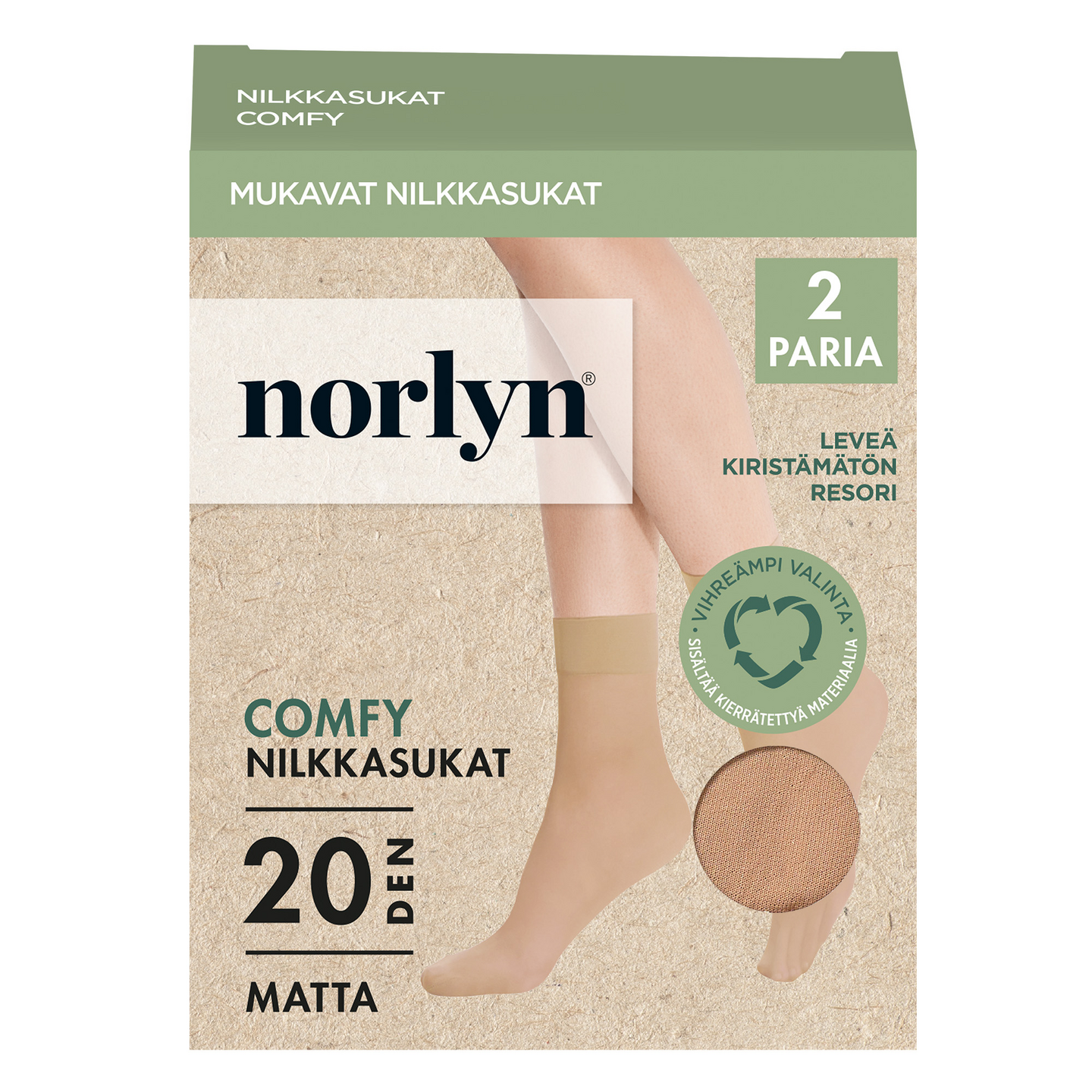 Norlynin 20 denierin mattapintaiset nilkkasukat kahden parin pakkauksessa. Sukissa erittäin pehmeä ja leveä resori lisäämässä käyttömukavuutta sekä huomaamaton kärkivahvike. Tuotteen materiaalista 53% on kierrätettyä. Varren pituus koossa 36-41 on 19 cm mitattuna kantapäästä. Koostumus: 53% kierrätetty polyamidi, 35% polyamidi, 12% elastaani