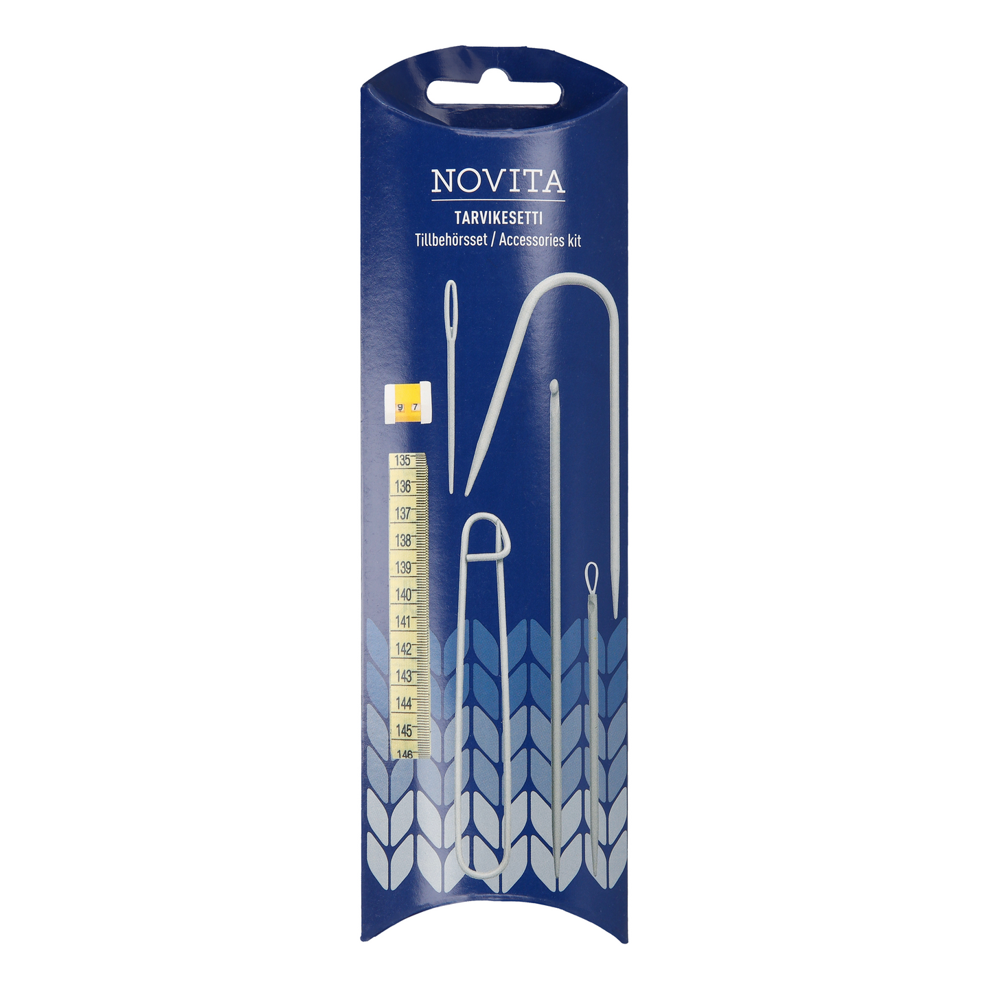 Neulojalle ja virkkaajalle Novitan näppärä Tarvikesetti! Setti sisältää 7 kpl tarpeellisia apuvälineitä; mittanauhan, viimeistelyneulan, apuvälineen langan pujottamiseen neulansilmään, puikkokoukun, silmukanpidikkeen, kerroslaskimen ja apupuikon esim. palmikon neulomiseen.