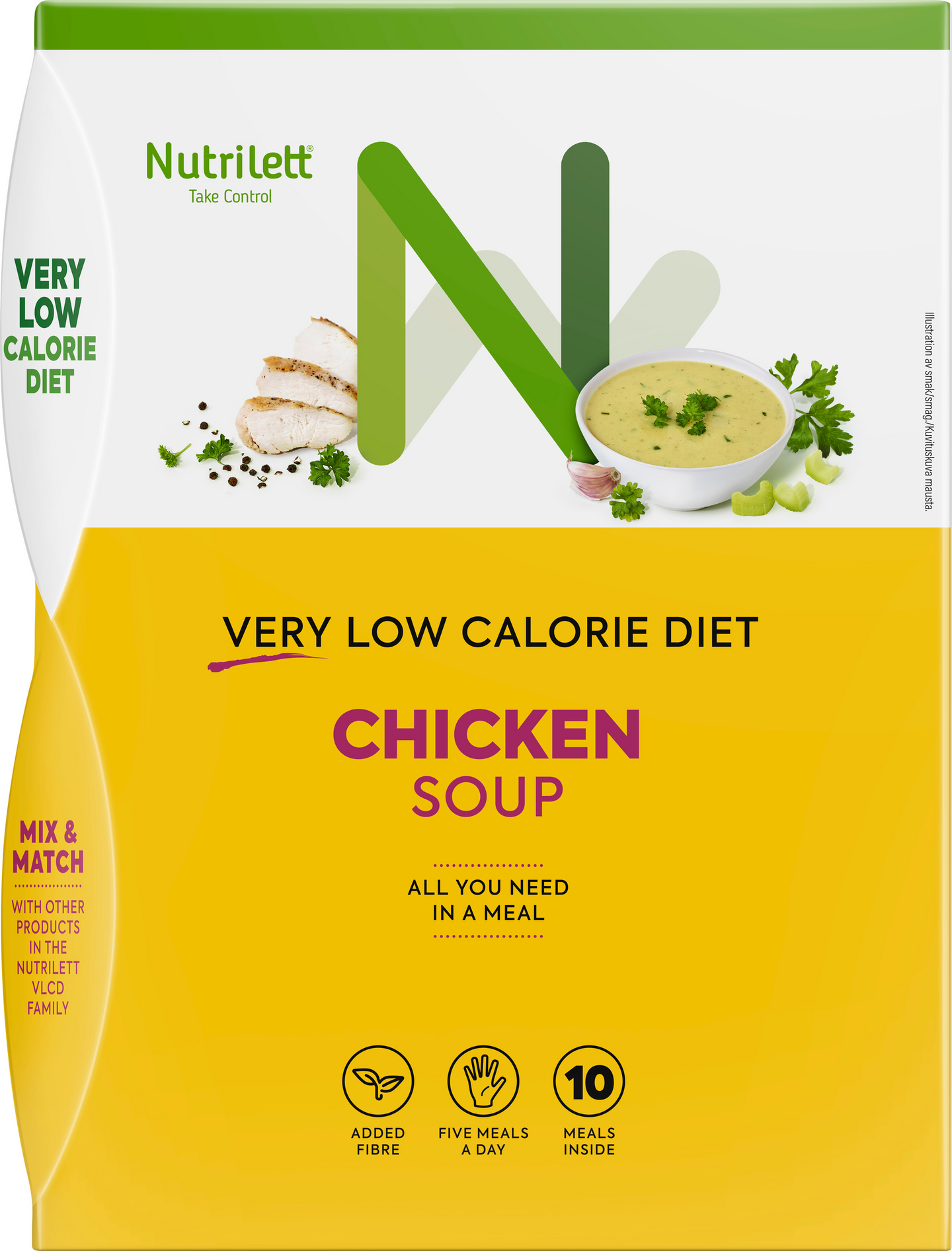Nutrilett Chicken soup on painonhallintaan tarkoitettu erittäin niukkaenergiainen ruokavalionkorvike. Yksi annos valmista kanakeittoa sisältää 2 g lisättyä kuitua. Nutrilett-ruokavalionkorvikkeet tarjoavat nopean ja tehokkaan tavan pudottaa painoa. Tuotteet sisältävät kaikki elimistön tarvitsemat ravintoaineet, kuten vitamiinit, kivennäisaineet, proteiinin ja välttämättömät rasvahapot. Very Low Calorie Diet (VLCD) perustuu erittäin niukkaenergiaiseen ruokavalioon, jossa päivän kaikki ateriat korvataan VLCD-tuotteilla. Tällöin päivittäinen energiansaanti jää alle 800 kcal:n. Pakkauksessa on 10 annospussia.