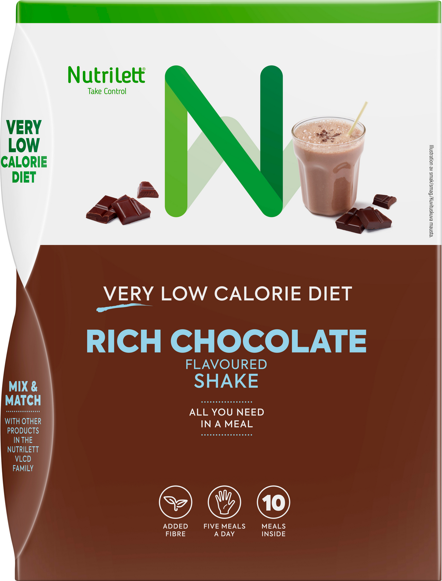 Nutrilett Chocolate shake on painonhallintaan tarkoitettu erittäin niukkaenergiainen ruokavalionkorvike. Yksi annos suklaanmakuista pirtelöä sisältää 2,2 g lisättyä ravintokuitua. Tuotteessa käytetty kaakao on Rainforest Alliance -sertifioitu. Nutrilett-ruokavalionkorvikkeet tarjoavat nopean ja tehokkaan tavan pudottaa painoa. Tuotteet sisältävät kaikki elimistön tarvitsemat ravintoaineet, kuten vitamiinit, kivennäisaineet, proteiinin ja välttämättömät rasvahapot. Very Low Calorie Diet (VLCD) perustuu erittäin niukkaenergiaiseen ruokavalioon, jossa päivän kaikki ateriat korvataan VLCD-tuotteilla. Tällöin päivittäinen energiansaanti jää alle 800 kcal:n. Pakkauksessa on 10 annospussia.
