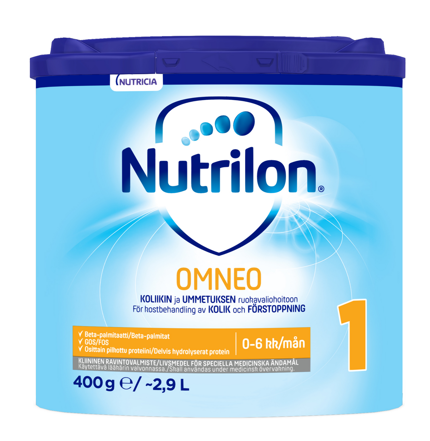 TÄRKEÄÄ: Äidinmaito on imeväisen parasta ravintoa. Nutrilon Omneo 1 -valmistetta on käytettävä hoitavan lääkärin ohjeiden mukaan. Voidaan käyttää syntymästä alkaen, jos äidinmaito ei riitä tai lasta ei imetetä. Vain suun kautta tai syöttöletkulla annettavaksi. Soveltuu tarvittaessa ainoaksi ravinnoksi alle 6 kk:n ikäiselle. Lapsen terveyden kannalta on tärkeää noudattaa tarkoin pakkauksessa olevia valmistus- ja säilytysohjeita.