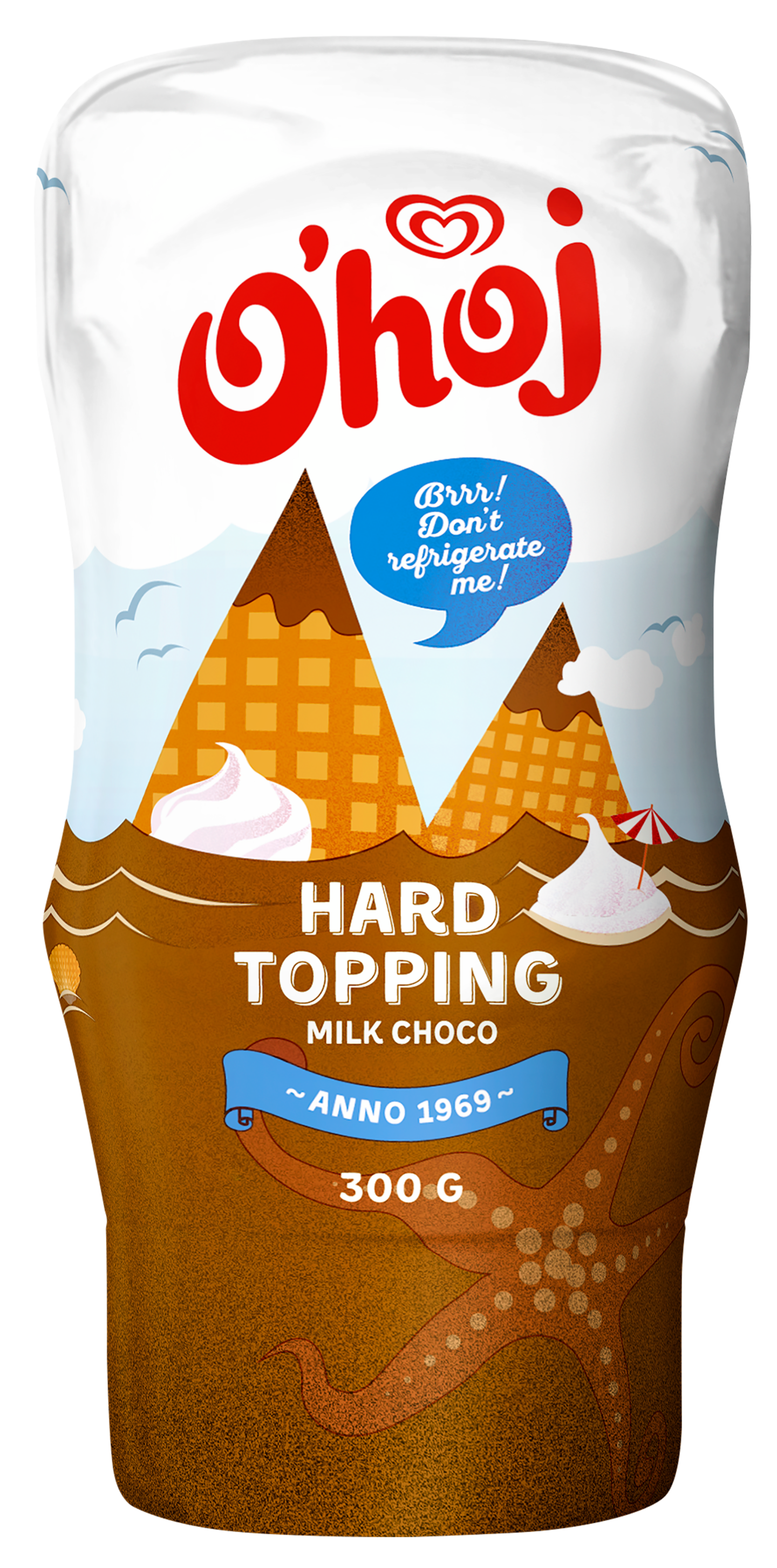 Tee jälkiruoastasi erityisen herkullinen O’Hoj’-maitosuklaakastikekuorrutuksella, joka kovettuu rapeaksi kylmän jäätelön tai jälkiruoan päällä
