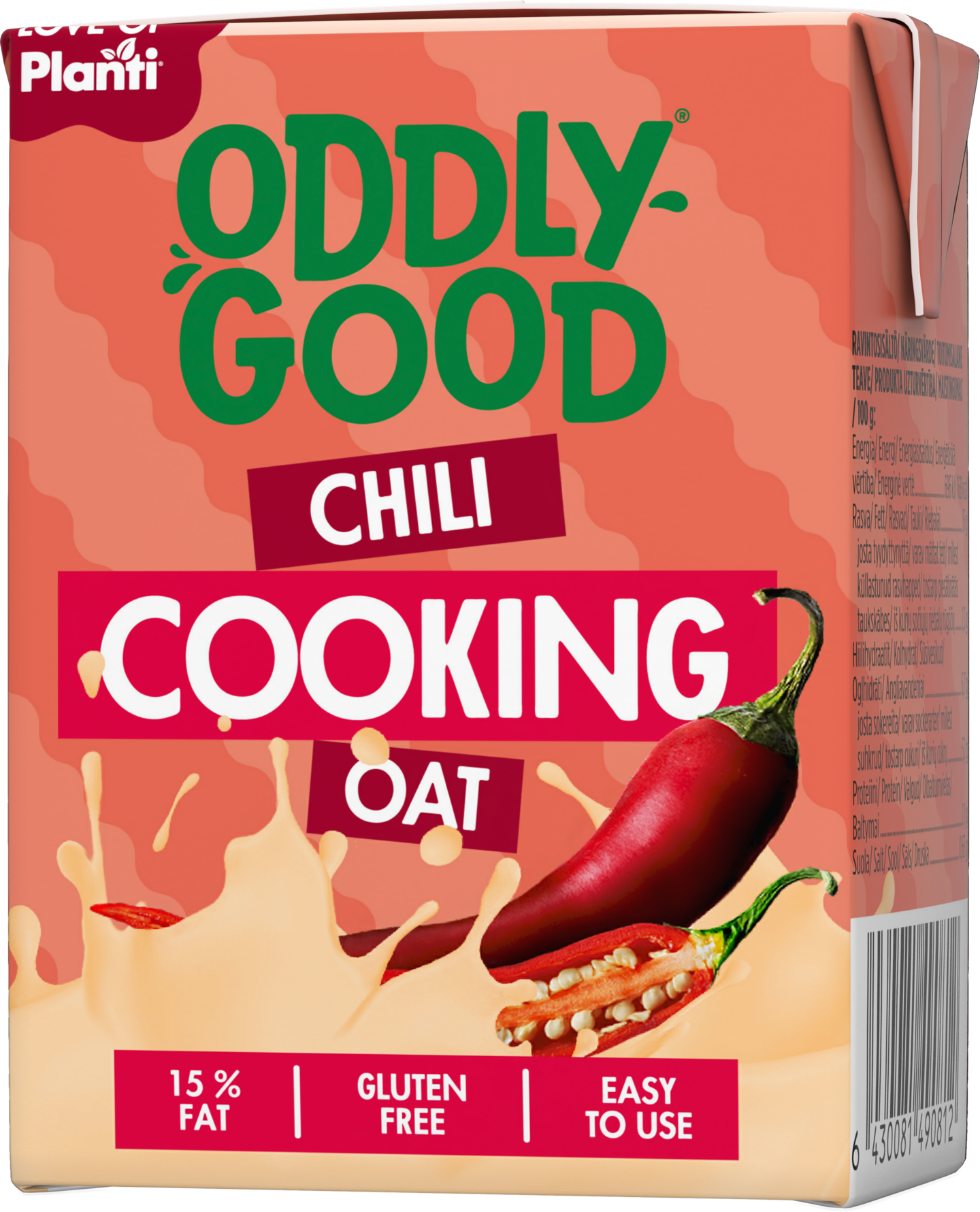 VegaaninenOddlygood® Cooking Oat chili tuo kauran pehmeyttä kokkailuun - nyt gluteenittomana! Tämä monen kokkaajan luottotuote on ollut aiemmin saatavilla nimellä Oddlygood® Planti Cooking Oat chili. Nyt tuote on siirtynyt Oddlygoodin alle - ja on samalla muuttunut gluteenittomaksi. Käytä kuin maustettua ruokakermaa, kun haluat saada pientä chilin potkua ruokaan. Cooking Oat tuo täyteläistä makua keittoihin ja pastakastikkeisiin ja kestää hyvin myös hauduttamista. Sillä teet myös mehevät piirakat. Kokkailemisiin!