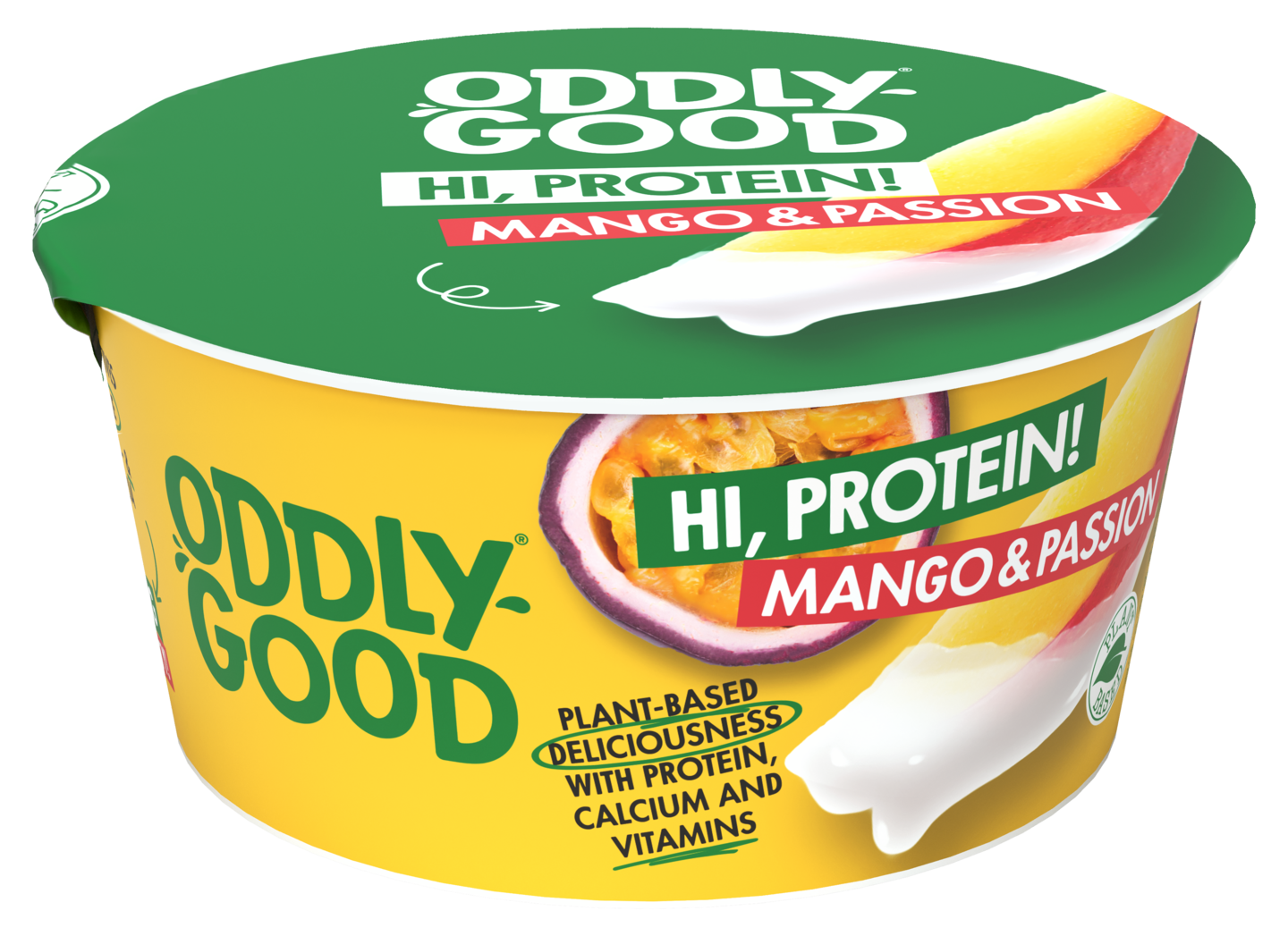 vesi, sokeri, SOIJAPROTEIINI 5 %, mangosose 3,5 %, passiohedelmätäysmehu tiivisteestä 3,4 %, muunnettu tärkkelys, gluteeniton KAURAJAUHO, kookosmaitojauhe, kasviöljyt (rapsi, rypsi), tärkkelys, kalsium, aromit, väri (karotenoidit), suola, happamuudensäätöaine (natriumsitraatit), vitamiinit (riboflaviini (B2), B12, D2), jodi, hapate, Lactobacillus acidophilus, Bifidobacterium sp.